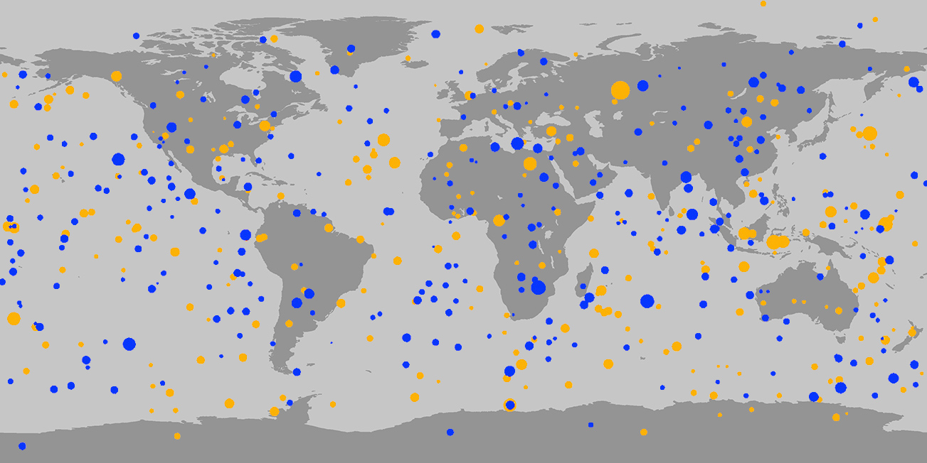 The map above indicates the locations where small asteroids crashed into Earth’s atmosphere between 1994 and 2013. Each of these 556 events resulted in a very bright meteor—also known as a bolide or fireball. On the map, orange dots represent daytime impacts and blue represents nighttime. The size of each dot is proportional to the radiated energy of the fireball, measured in billions of Joules (GigaJoules).