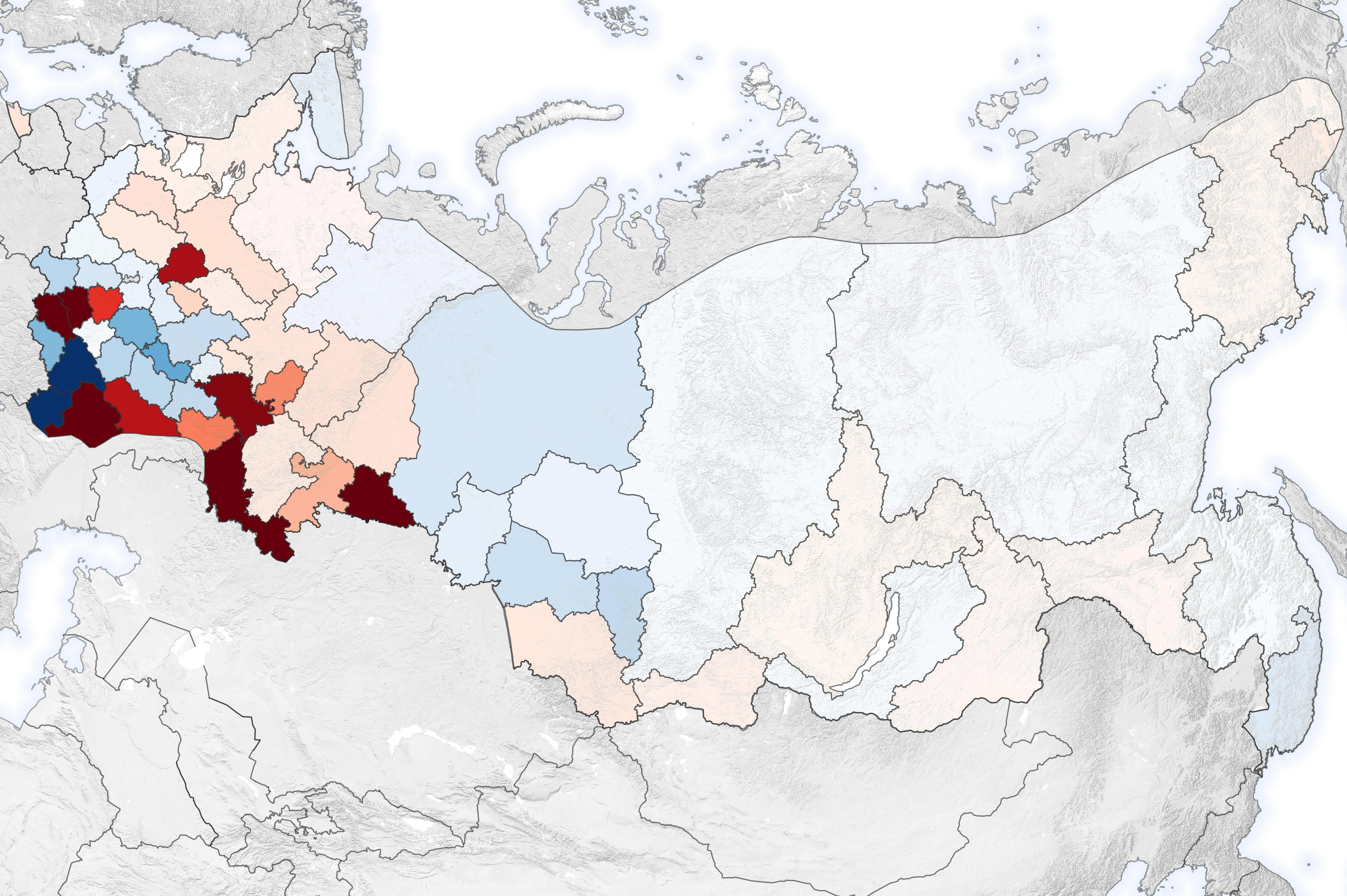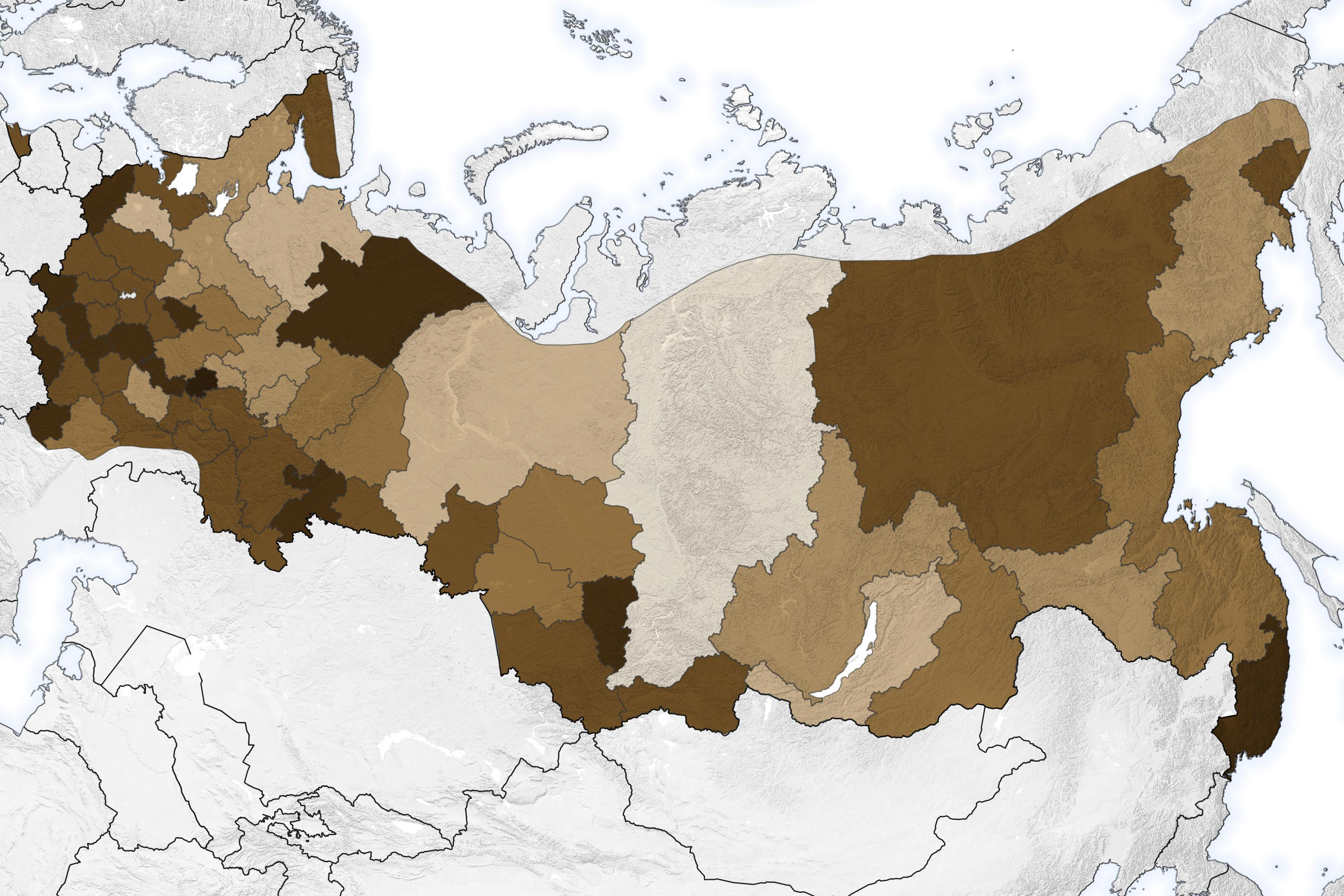 The chart above shows the total moose population across the country from 1981-2010, using data from the Russian Federal Agency of Game Animals. The map below shows geographic changes in moose populations for the same time period.