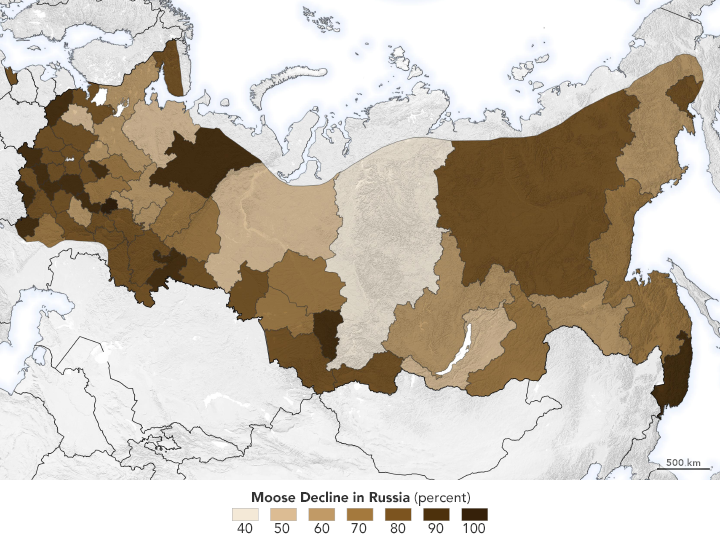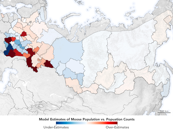 A team of researchers from the U.S., Europe, and Russia set out to use satellite data and computer models to figure out where moose live in Russia and why they should be more and less abundant in different regions. In theory, more abundant and seasonally consistent vegetation (food) should mean more moose, but they wanted to know whether vegetation health was the best predictor. Such models can be useful for managing animal species and conserving forests and other lands.