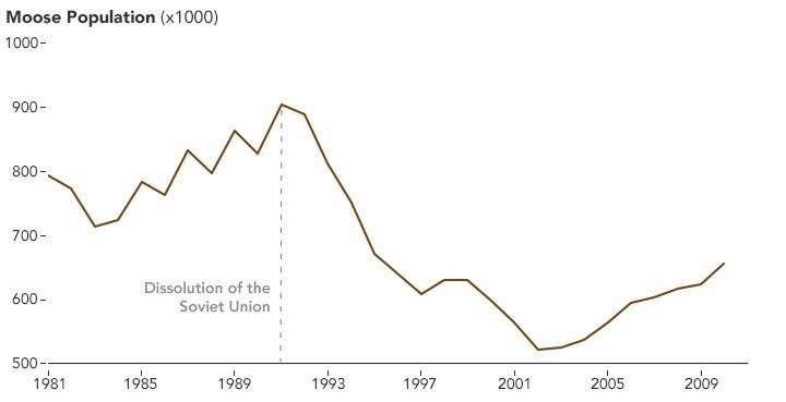 Previous research has shown that several animal populations declined substantially when the Soviet Union collapsed in the early 1990s and slowly evolved into the Russian Federation. In those years, the country faced a major economic shock and an increase in poverty. More people turned to hunting for food, and moose were on the menu. Additionally, environmental regulation and monitoring fell off as the government coped with other concerns.