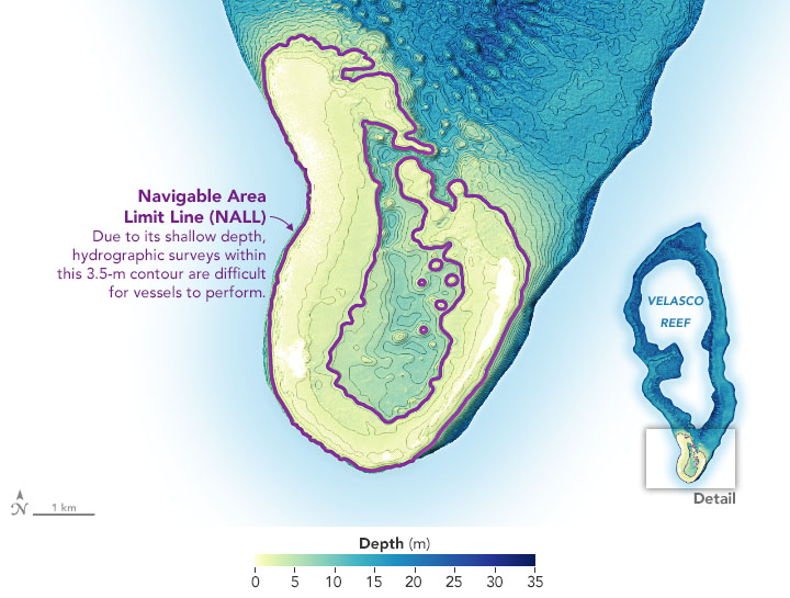 The maps above show the NALL regions around Velasco Reef and the current water depths as measured by Magruder and Parrish’s team. This use of ICESat-2 data could be a game-changer.