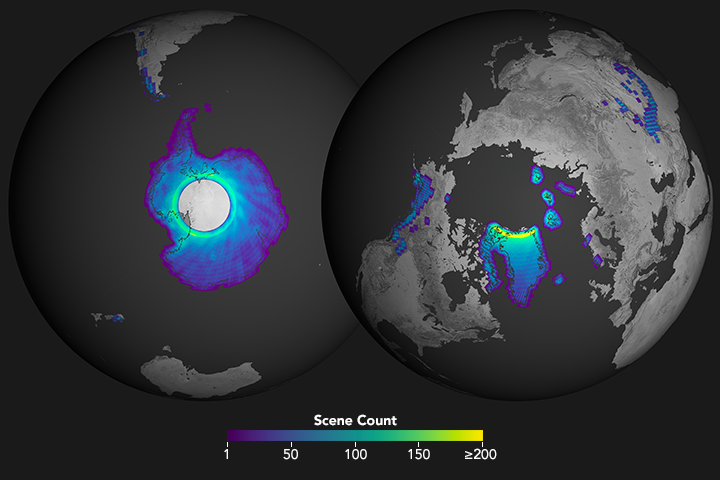 It also means there is a huge amount of data to process and analyze. From 2013 to 2016, Landsat 8 collected thousands of images from Antarctica alone. The globes above show how many times Landsat 8 passed over a given icy parcel in 2015 alone. As many as 150 to 200 images were collected over the brightest yellow and green areas, while purple areas had just a handful of useful images because of frequent cloud cover and fewer orbital passes. Due to the nature of the satellite’s polar orbit, areas in the far north and south can be imaged more frequently (when there is sunlight).