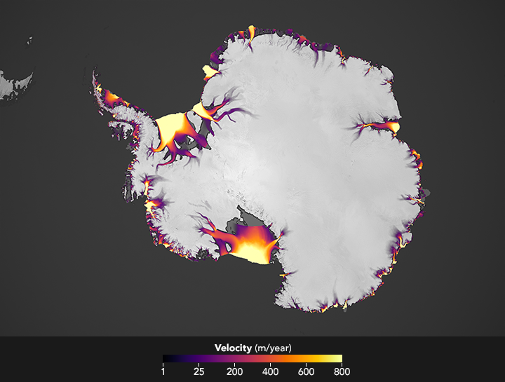 NASA Earth Observatory images by Joshua Stevens, using Landsat-derived ice velocity data courtesy of Alex Gardner, NASA Jet Propulsion Laboratory/California Institute of Technology and ASTER GDEM data from the NASA/GSFC/METI/ERSDAC/JAROS, and U.S./Japan ASTER Science Team . Caption by Kate Ramsayer and Mike Carlowicz.