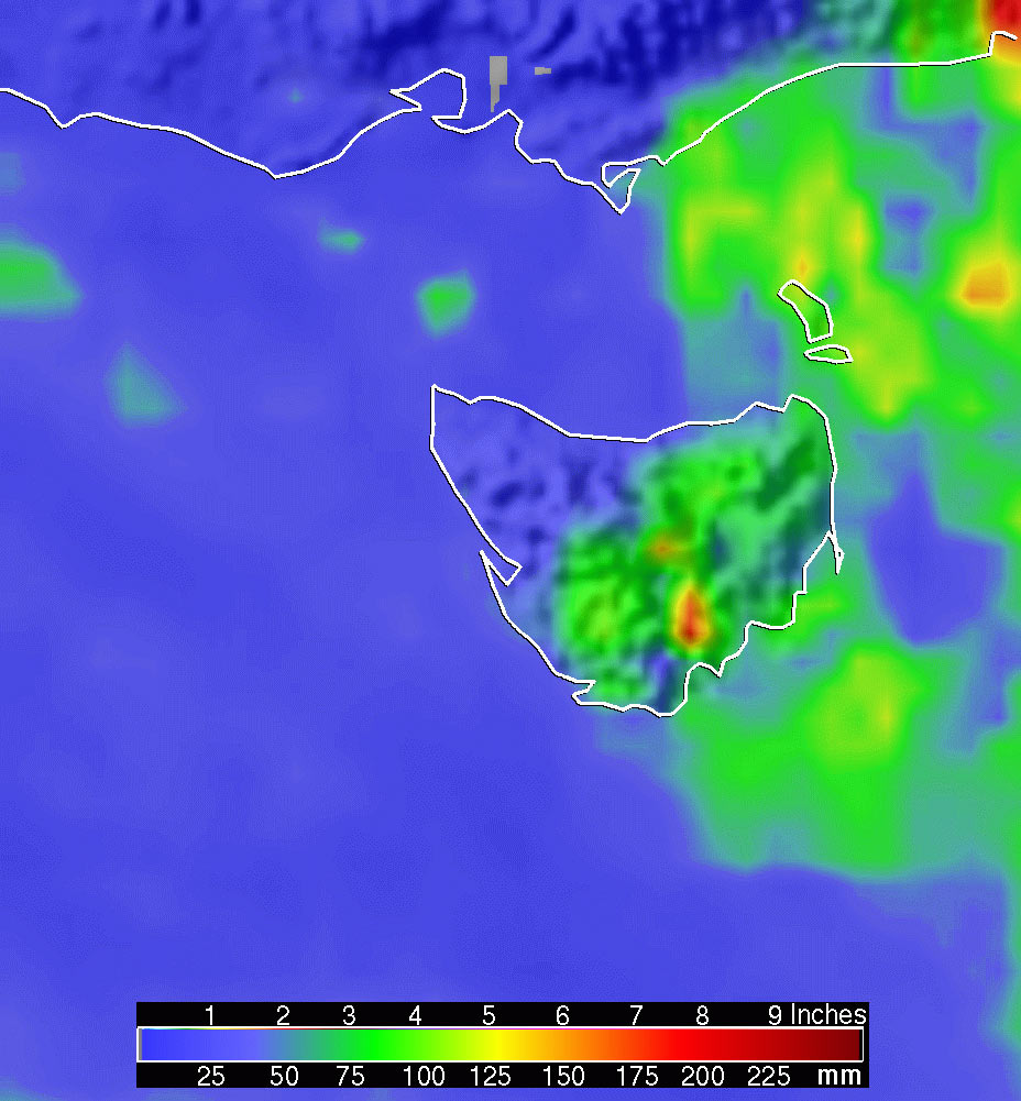 This image from the Tropical Rainfall Measuring Mission shows rainfall amounts over Tasmania during March 2003. This Australian state received record rainfall during the month, with many places receiving more rain than had ever been recorded. In this image, rainfall amounts appear in shades of blue (low to no rainfall) to red (highest rainfall).