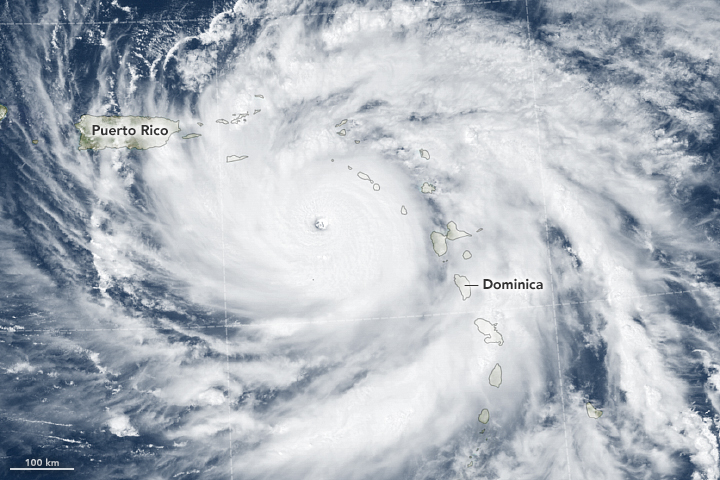 Several meteorologists noted that Maria had a very small, tight eye—sometimes called a “pinhole eye”—that was about 10 miles (16 kilometers) in diameter. Such tightly formed storms have been observed to spin faster. The storm briefly weakened to category 4 after crossing Dominica but then re-intensified to category 5.