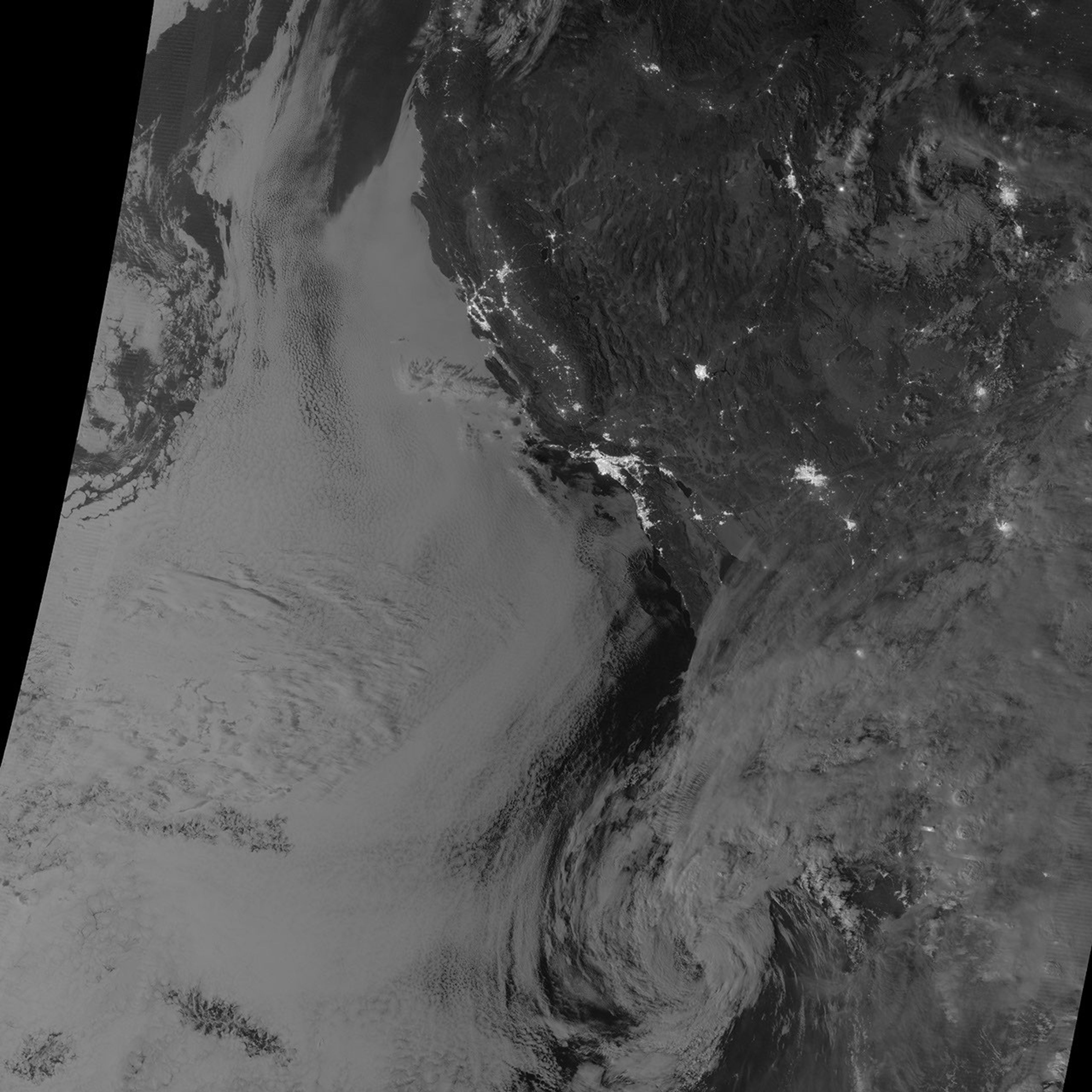 On September 27, 2012, the Visible Infrared Imaging Radiometer Suite (VIIRS) on the Suomi NPP satellite captured this nighttime view of low-lying marine layer clouds along the coast of California.