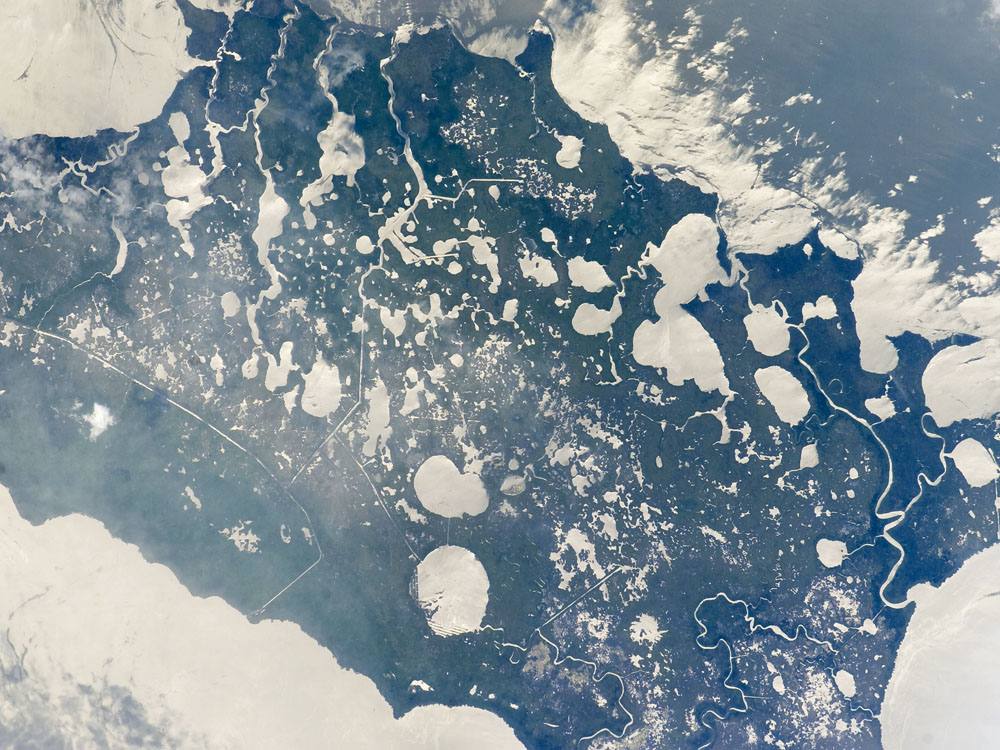 Marsh Island, located along the southwestern coastline of Louisiana, is a remnant of an abandoned lobe of the Mississippi River Delta formed approximately 5,000–7,500 years ago. It is composed primarily of organic-rich muds and brackish marsh vegetation, but some peat (layers of vegetation that have partially decomposed while submerged in water) is also present. In this astronaut photograph, silver-gray sunglint highlights the intricate network of lakes, ponds, and streams on the island. (Sunglint is the mirror-like reflection of sunlight off water surfaces directly back to the astronaut onboard the International Space Station.)