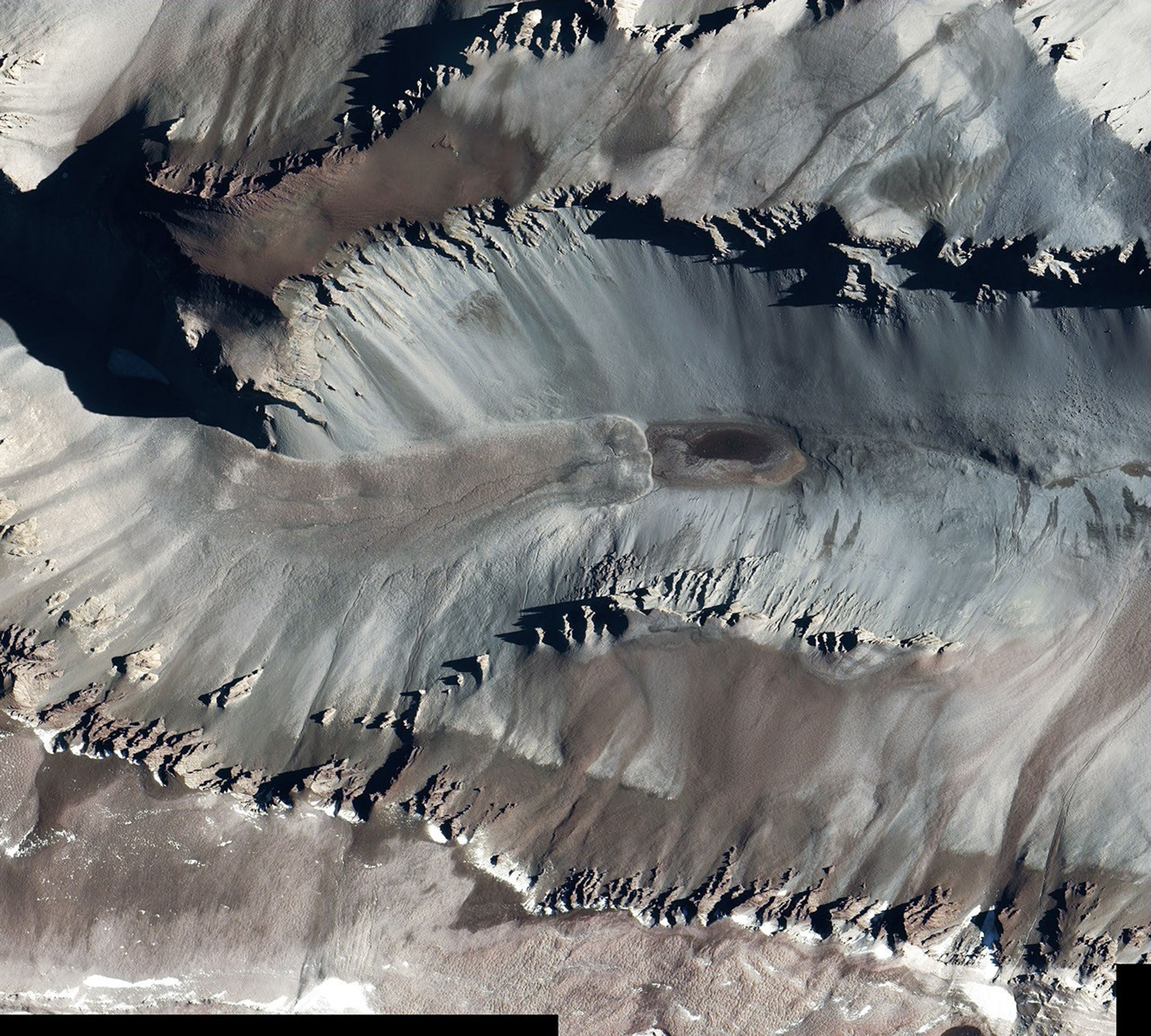 Of all the diverse landscapes on Earth, the McMurdo Dry Valleys in Antarctica may be the most like Mars. Extremely cold and extremely dry, the Dry Valleys arelocated near McMurdo Sound on the coast of Antarctica (roughly 77° South, 161° East). Unlike the rest of the continent, the McMurdo Dry Valleys are primarily free of snow and ice. This image shows water-carved channels along the lower slopes of Wright Valley. Scientists compare satellite and airborne images of the Dry Valleys with images taken from orbit around Mars. Similar features on Mars acquired by the Mars Orbital Camera suggest that the Red Planet had liquid water in the past.