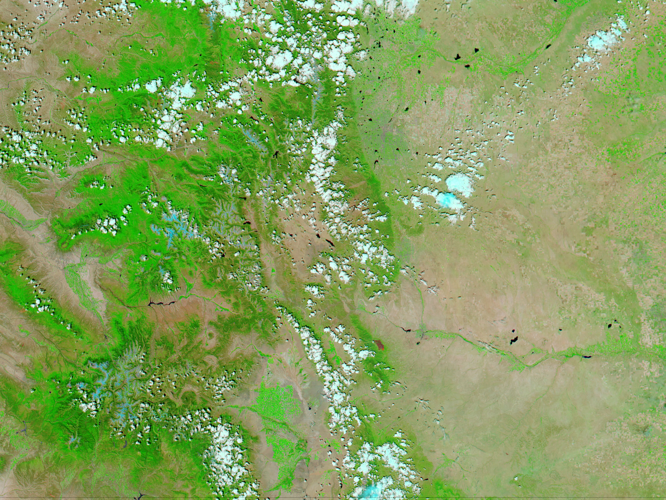 This image was captured by the Moderate Resolution Imaging Spectroradiometer (MODIS) on NASA’s Aqua satellite on July 11, 2005. The image is an infrared-enhanced, false-color image in which vegetation is bright green, water is blue, naturally bare or thinly vegetated land is tan or light pink, and burned areas are reddish-brown.