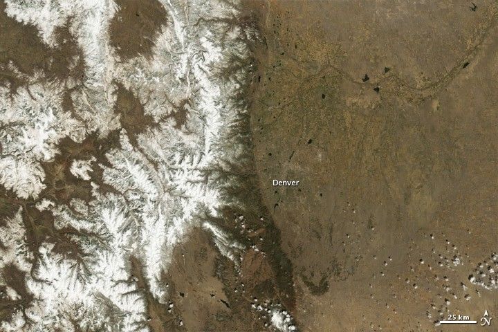 The Moderate Resolution Imaging Spectroradiometer (MODIS) on NASA’s Terra satellite captured the top image on May 2 after clouds had mostly cleared out of the Denver region. For comparison, the bottom image shows the same area on April 27, 2013, before the storm struck. Although far less dramatic than snow cover in February, the May Day snow nevertheless covered a wide area, especially for so late in the spring.