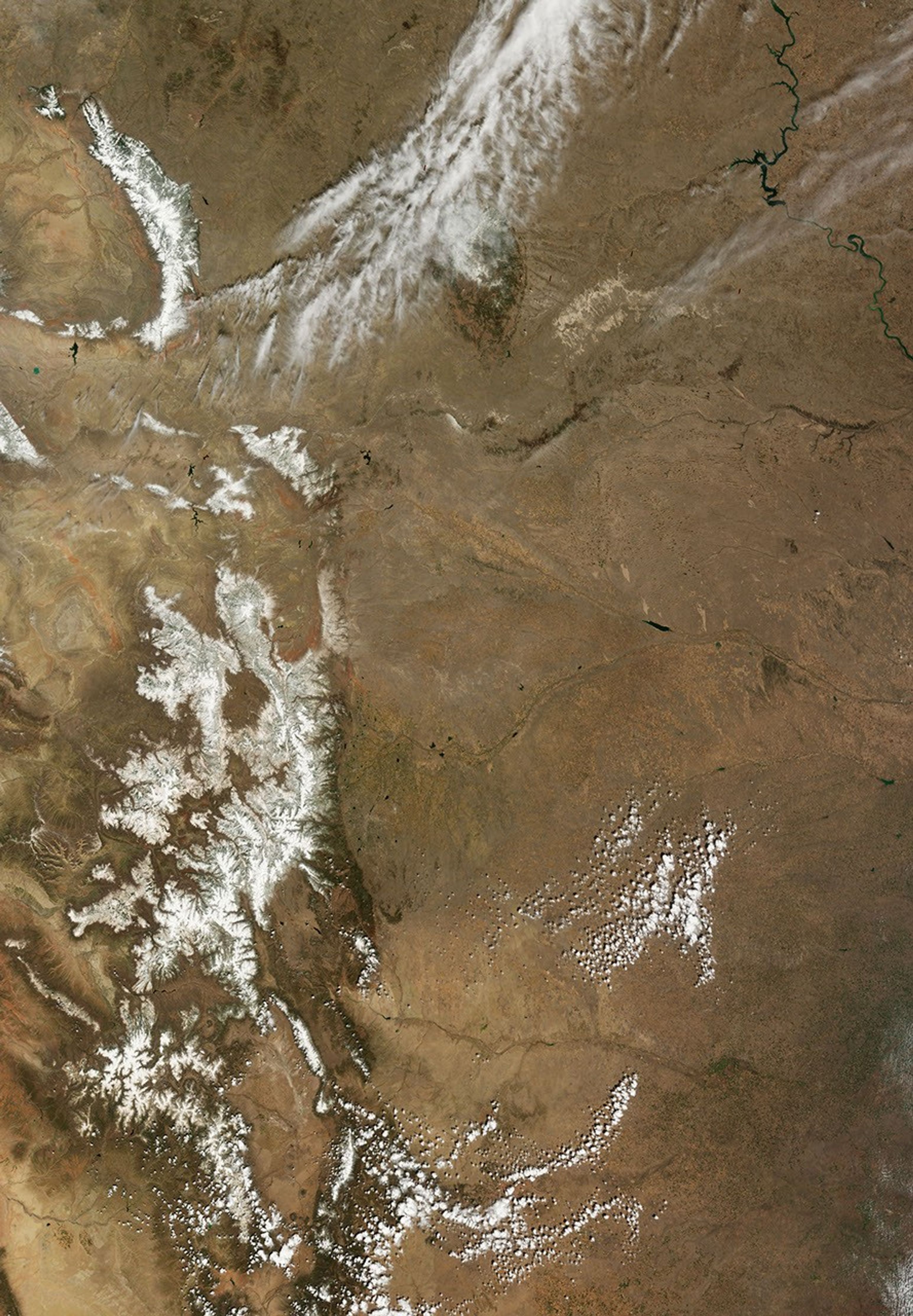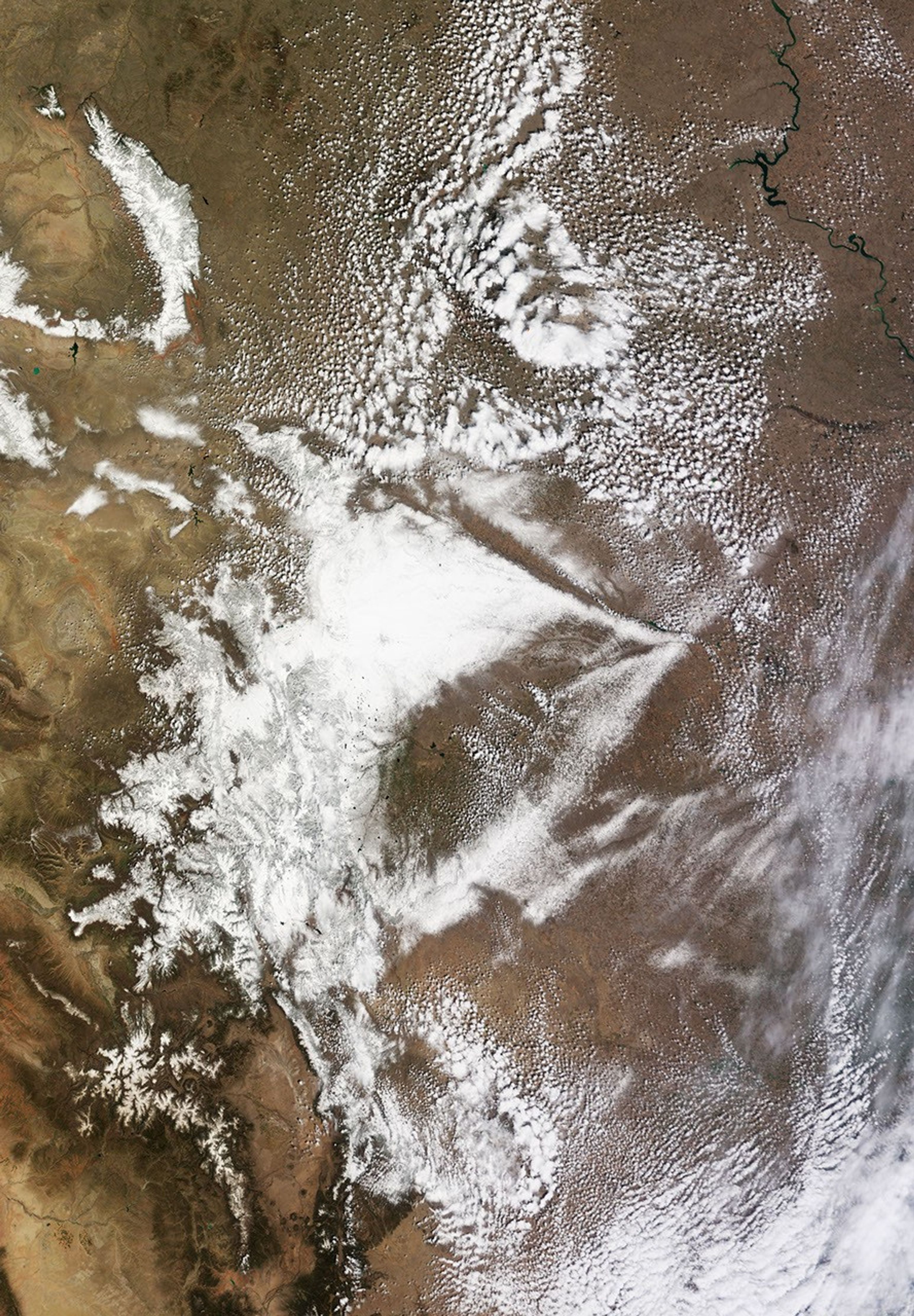 The Moderate Resolution Imaging Spectroradiometer (MODIS) on NASA’s Terra satellite captured the top image on May 2 after clouds had mostly cleared out of the Denver region. For comparison, the bottom image shows the same area on April 27, 2013, before the storm struck. Although far less dramatic than snow cover in February, the May Day snow nevertheless covered a wide area, especially for so late in the spring.