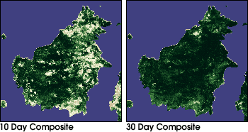Neither the NDVI nor the EVI product will eliminate all obstacles. Clouds and aerosols can often block the satellites’ view of the surface entirely, glare from the sun can saturate certain pixels, and temporary malfunctions in the satellite instruments themselves can distort an image. Consequently, many of the pixels in a day’s worth of images are indecipherable, and maps made from the daily Vegetation Indices are patchy at best.