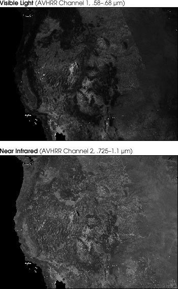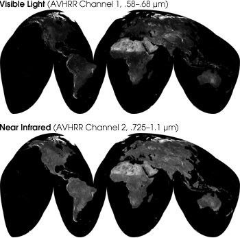 The NOAA AVHRR instrument has five detectors, two of which are sensitive to the wavelengths of light ranging from 0.55–0.70 and 0.73–1.0 micrometers. With AVHRR’s detectors, researchers can measure the intensity of light coming off the Earth in visible and near-infrared wavelengths and quantify the photosynthetic capacity of the vegetation in a given pixel (an AVHRR pixel is 1 square km) of land surface. In general, if there is much more reflected radiation in near-infrared wavelengths than in visible wavelengths, then the vegetation in that pixel is likely to be dense and may contain some type of forest. If there is very little difference in the intensity of visible and near-infrared wavelengths reflected, then the vegetation is probably sparse and may consist of grassland, tundra, or desert.
