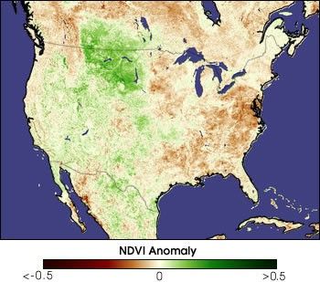 The above image shows the NDVI anomaly in the U.S. for August 1993. In that year, heavy rain in the Northern Great Plains (North and South Dakota, Alberta, and Saskatchewan) led to flooding in the Missouri River. The resulting exceptionally lush vegetation appears as a positive anomaly (green). Concurrently, in the Eastern U.S., rainfall was very low, and the region exhibited a strong negative anomaly (dark red).