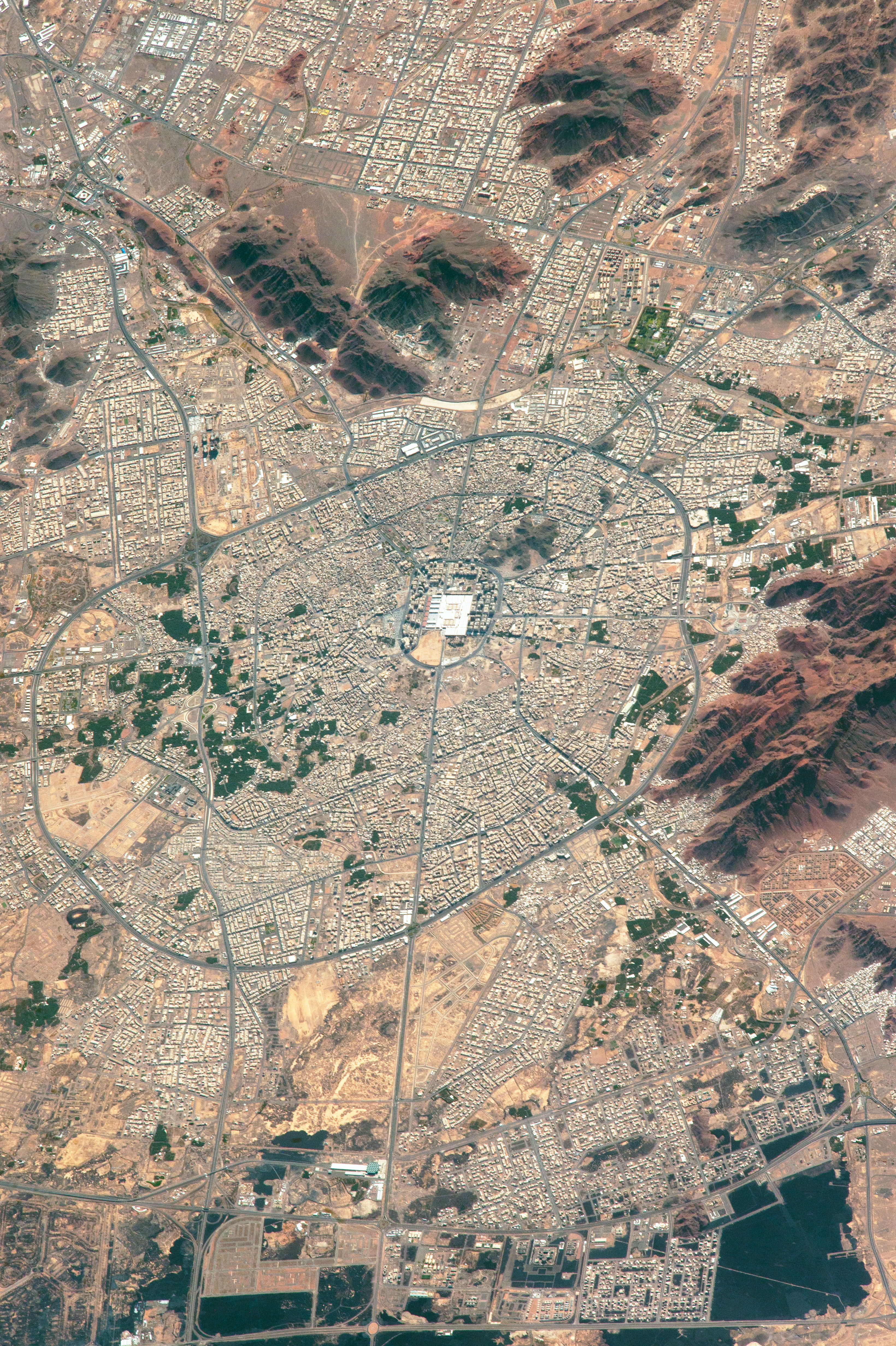 An astronaut aboard the International Space Station focused a high-resolution lens on the city of Medina (Madinah in official documents) in western Saudi Arabia. Medina is the second holiest city of Islam, and the site of the Prophet’s Mosque (Al-Masjid an-Nabawi) and the Prophet’s Tomb. The mosque, one of the largest in the world, is the focal point of the city.