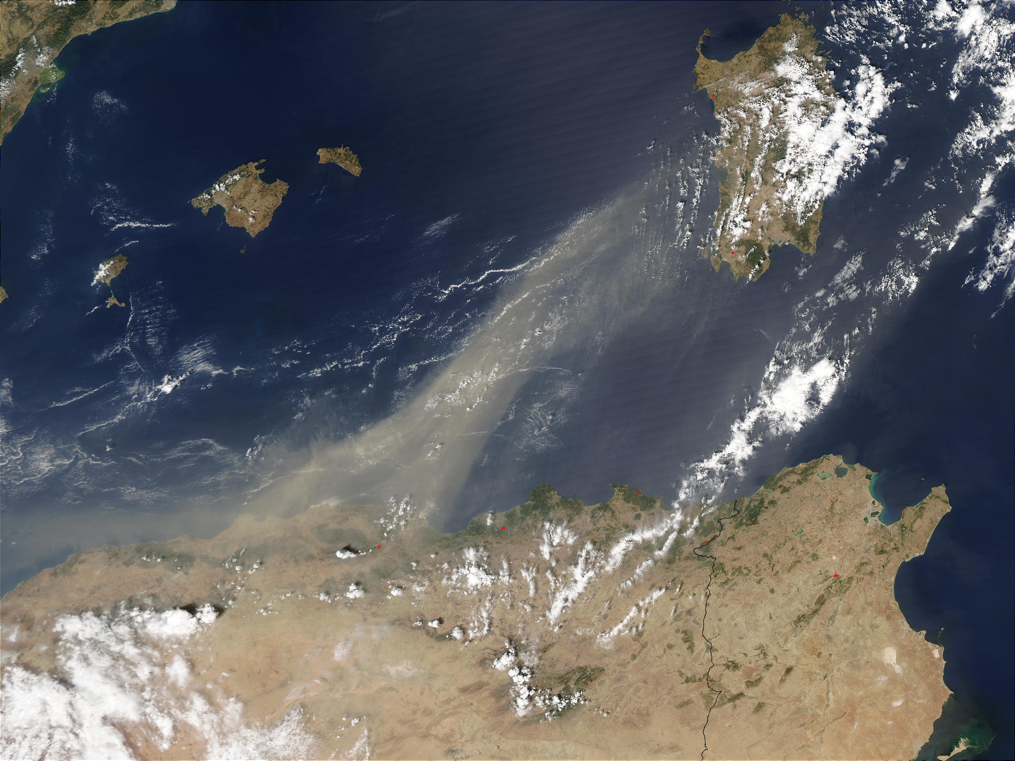 A dust storm was blowing over the Mediterranean Sea from Algeria (left) on August 19, 2003. This image of the storm was captured by the Moderate Resolution Imaging Spectroradiometer (MODIS) on the Aqua satellite. A few fires have been detected by MODIS and are marked with red dots across Algeria, Tunisia (to the east) and the island of Sardinia (to the northeast).