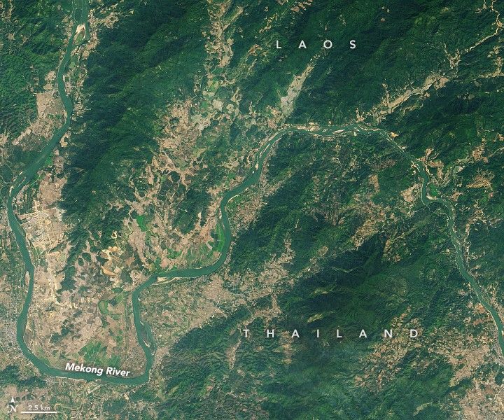 The color change was first reported in northern Thailand in November 2019, and has since spread along the Lower Mekong. The images above show the river near the town of Huay Xai in Laos. The left image shows the river under normal, sediment-laden conditions on January 27, 2015, compared to conditions on January 25, 2020. Both images were acquired by the Operational Land Imager (OLI) on Landsat 8.