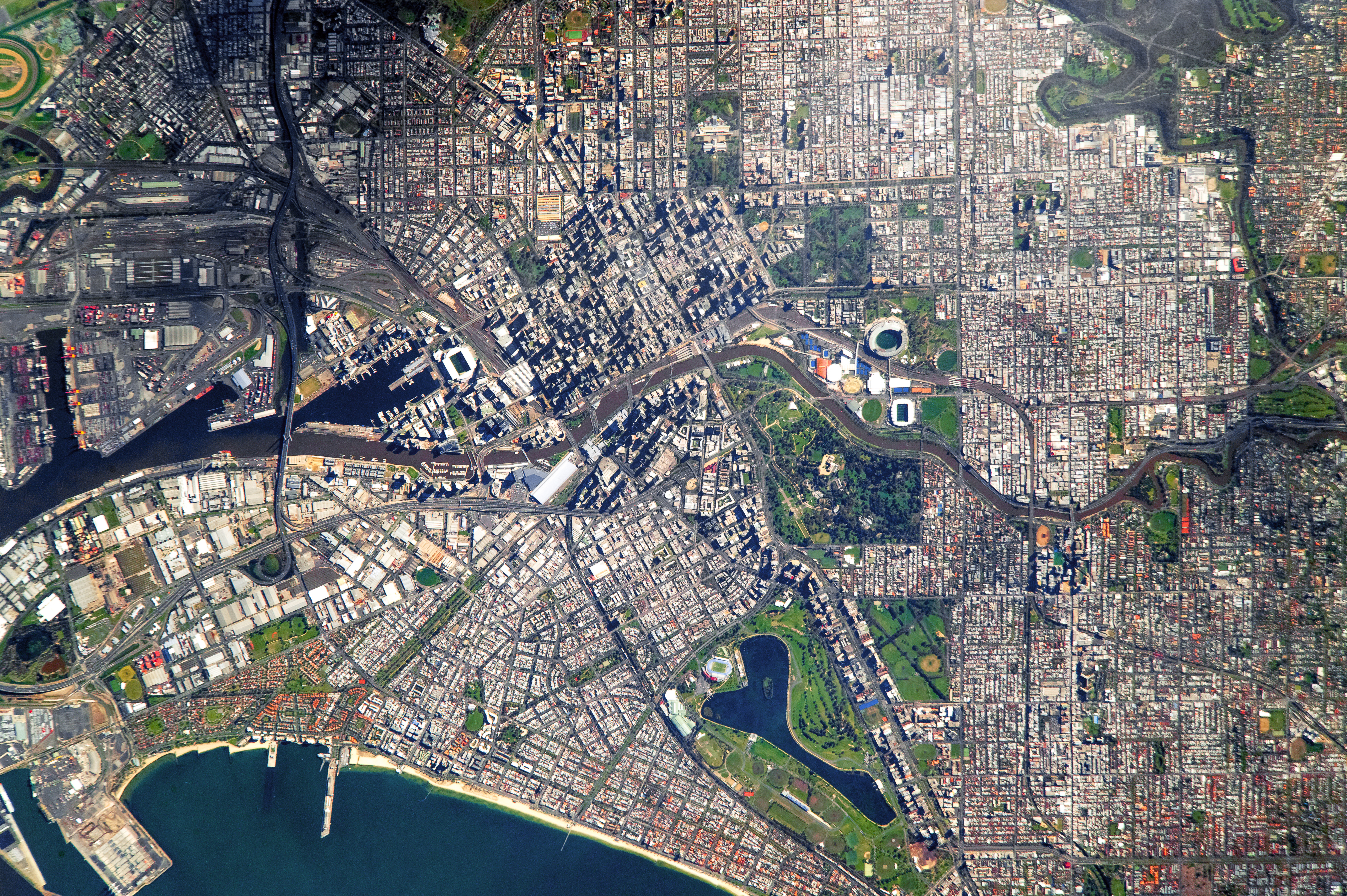Flying over southeastern Australia, an astronaut aboard the International Space Station took this photograph of the center of Melbourne. With a population of about 4.5 million people (as of 2015), greater Melbourne is the second-most populous city in Australia after Sydney.