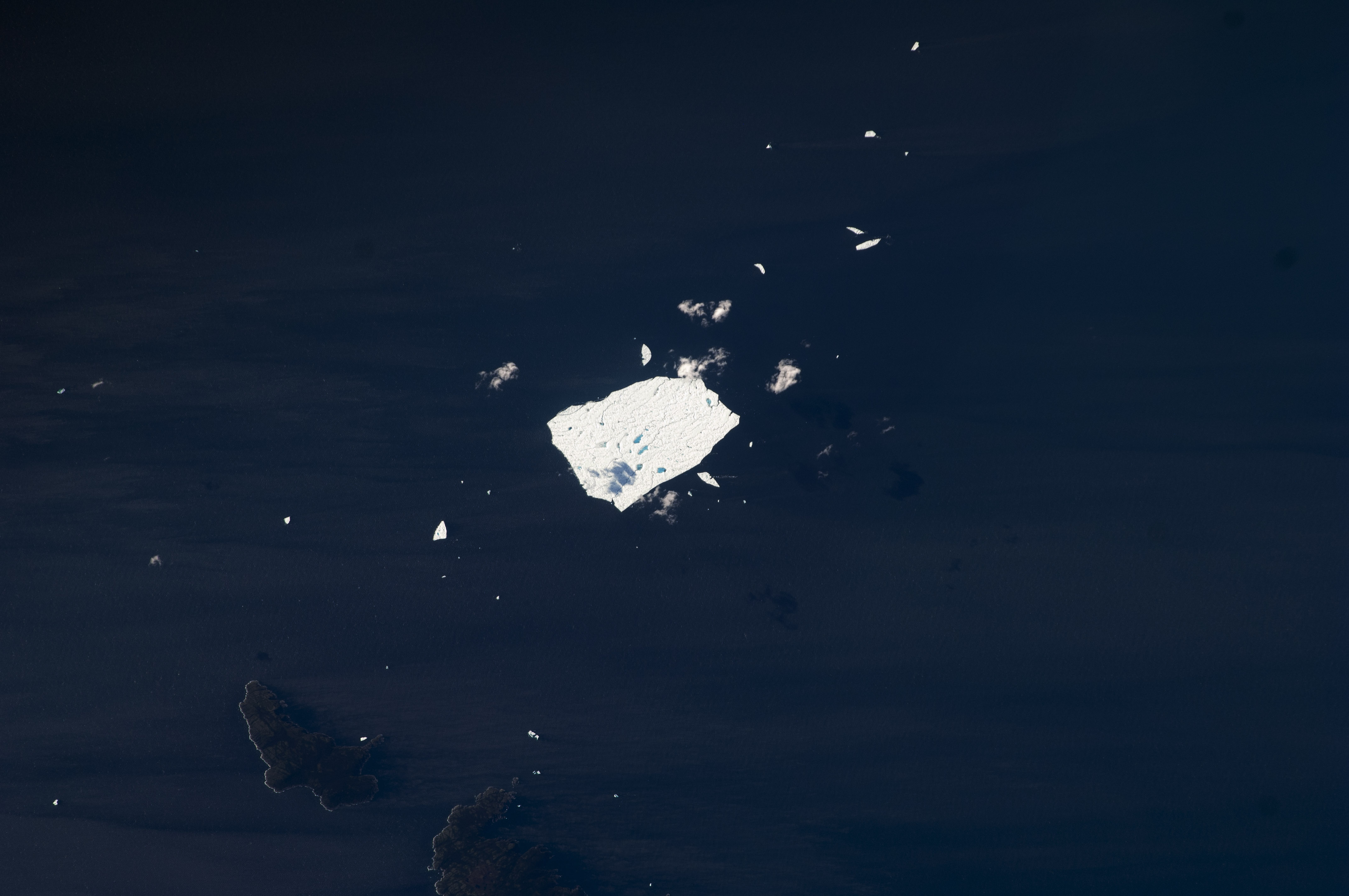 Astronauts on the International Space Station used a digital camera to capture this view of Petermann Ice Island A, fragment 2, off of the northeast coast of Newfoundland on August 29, 2011. Spanning roughly 4 kilometers by 3.5 kilometers (2.5 by 2 miles), the ice island is covered with melt ponds and streams, much as the surface of Greenland looks in mid-summer.