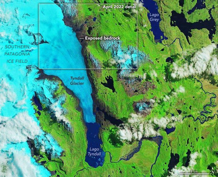 The pair of satellite images at the top of this page shows the glacier’s edge on January 14, 1986, and on January 17, 2022. The images were acquired by the Thematic Mapper on Landsat 5, and by the Operational Land Imager (OLI) on Landsat 8, respectively. The false-color allows a better color match between the two images that were collected by different sensors.