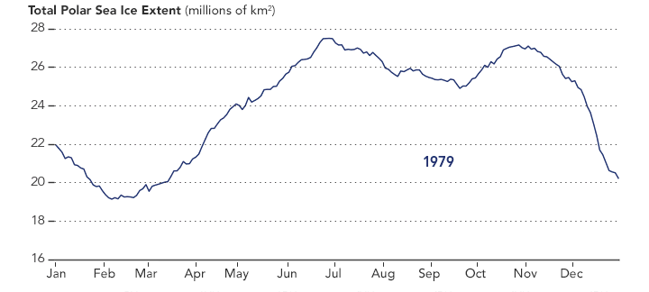 In recent years, notably from 2012 to 2014, the period of refreezing has culminated in record-high maximum extents. On an annual basis, the total Antarctic sea ice extent has increased about 1 percent per decade since 1979. Still, the long-term trend still shows a global decline in sea ice. The chart of global extent demonstrates how, over the long term, the slight increases in Antarctic sea ice have not offset the large losses in the Arctic.