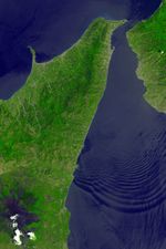 Even today, the Messina Strait’s strong currents can rip seaweed from the ocean floor. The main current runs from south to north, but a smaller current runs in the opposite direction. The currents alternate about every six hours, and the strait’s complicated wave patters can be seen from space. On August 11, 2003, the Advanced Spaceborne Thermal Emission and Reflection Radiometer (ASTER) on NASA’s Terra satellite took this picture of the Messina Strait. When this picture was taken, the Sun was at just the right angle to illuminate two sets of waves. The more obvious set appears as a series of concentric rings pushing toward the south. Perpendicular to the strong waves are shallower waves that give the water a rough appearance.