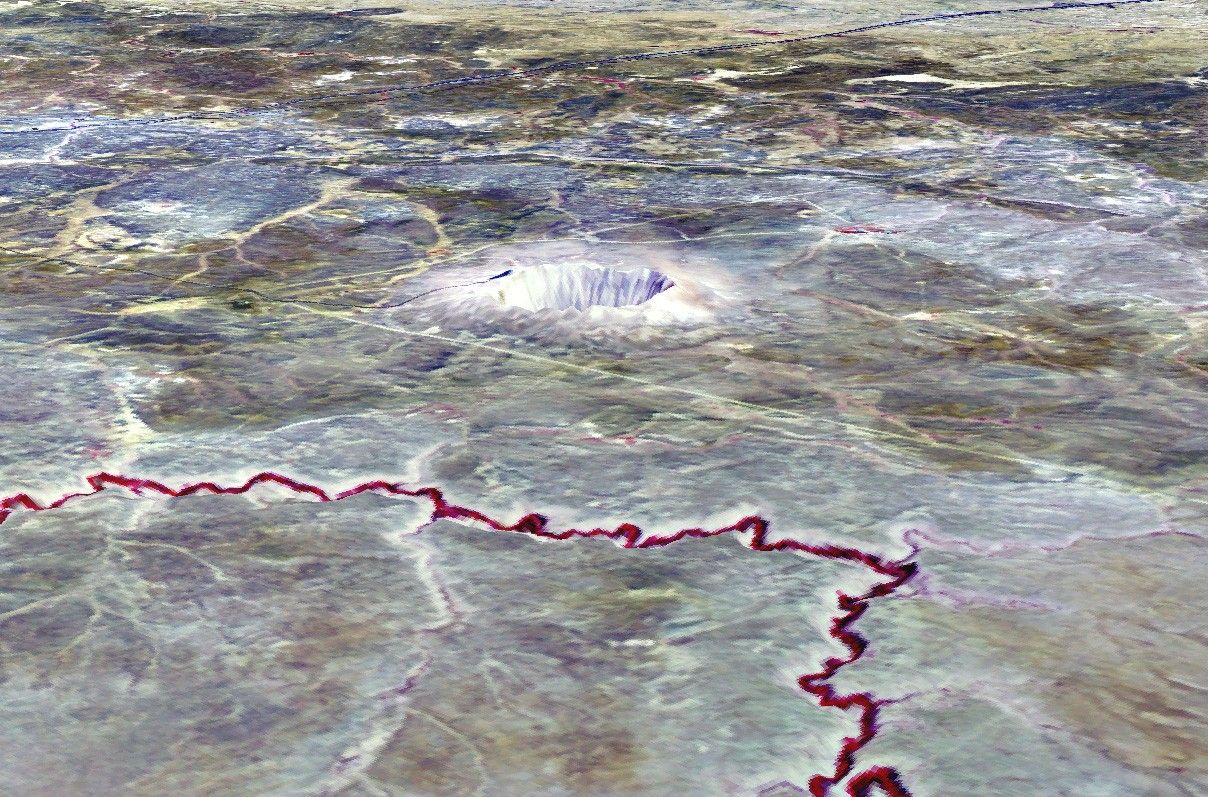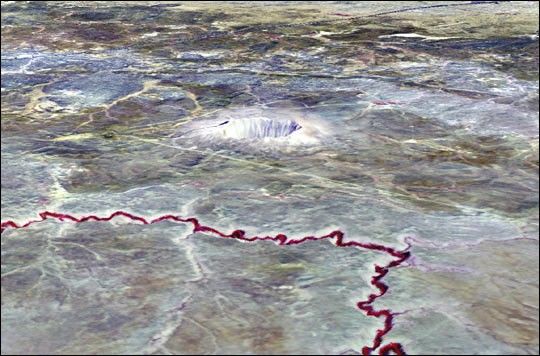 The Barringer Meteorite Crater (also known as “Meteor Crater”) is a gigantichole in the middle of the arid sandstone of the Arizona desert. A rim of smashedand jumbled boulders, some of them the size of small houses, rises 50 meters above the surrounding plain. The crater itself is nearly a 1500 meters wide and 180 meters deep. When Europeans first discovered the crater, the plain around itwas covered with chunks of meteoritic iron—over 30 tons of it—scattered overan area 12 kilometers to 15 kilometers in diameter. Scientists now believe that the crater wascreated approximately 50,000 years ago. The meteorite itself was composedalmost entirely of nickel-iron, suggesting that it may have originated in theinterior of a small planet. It was 50 meters across, weighed roughly 300,000 tons,and traveled at a speed of 65,000 kilometers per hour. This Advanced Spaceborne ThermalEmission and Reflection Radiometer (ASTER) 3-D perspectiveview was created by draping a false-color image (near infrared=red, red=green, green=blue) over a digital elevation model made by the US Geological Survey National Elevation Dataset.