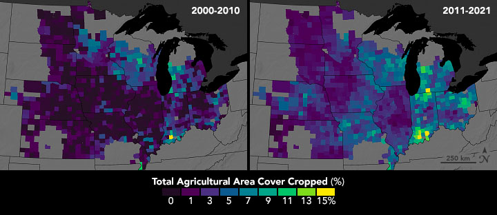 The study identified farm fields which used cover crops for three or more years by using a recently developed dataset of cover crop presence between 2000 to 2021. The dataset fused vegetation greenness data from Landsat and NASA’s Moderate Resolution Imaging Spectroradiometer (MODIS) to identify fields using cover crops. Cover crop adoption in the six states has increased fourfold during the past decade, the analysis revealed: from 1.8 percent of total crop acreage in 2011 to 7.2 percent in 2021.