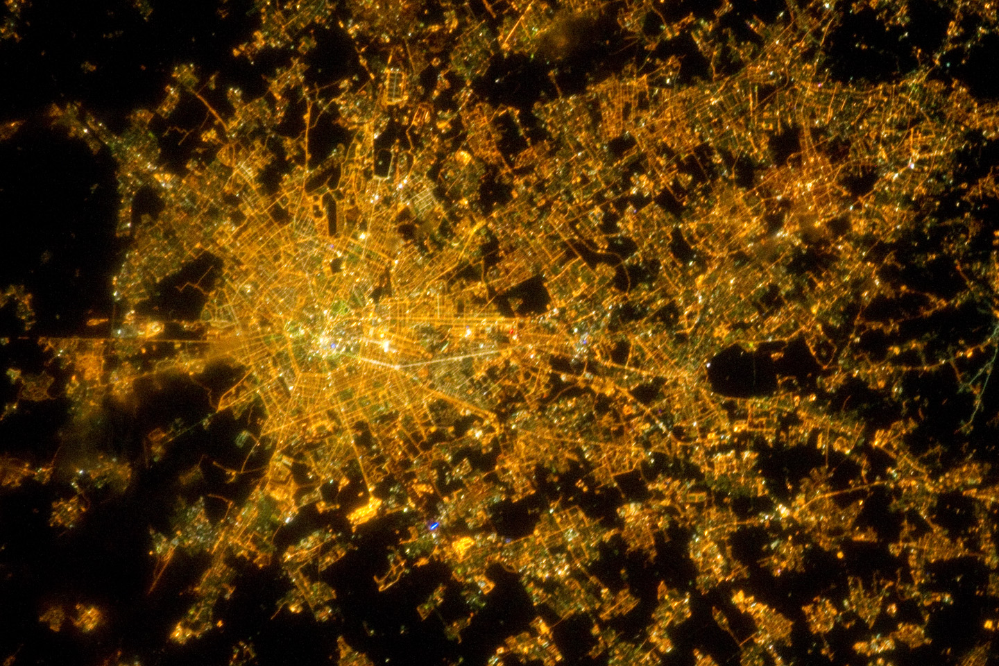 The metropolitan area of Milan (or Milano) illuminates the Italian region of Lombardy in a pattern evocative of a patchwork quilt. The city of Milan forms a dense cluster of lights in this astronaut photograph, with brilliant white lights indicating the historic center of the city where the Duomo di Milano (Milan Cathedral) is located.