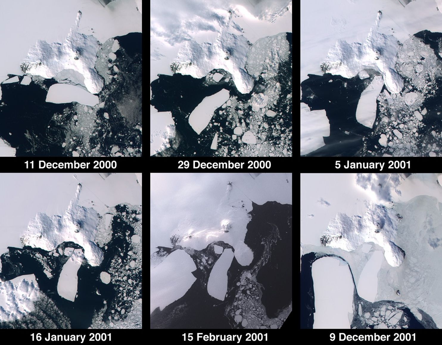 The images, taken between December 2000 and December 2001, depict the rapid motion of the C-16 iceberg in late 2000 and early 2001 and its subsequent stall, as well as the incursion of the B-15A iceberg, a large fragment of the original B-15 iceberg. The increase in sea ice is particularly pronounced in the final image.