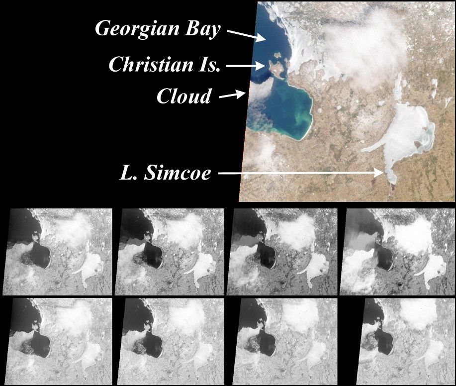 In each image in the top row, a fainter feature with the same shape asthe cloud is visible within Georgian Bay. The feature and the clouditself approach one another as the view angle becomes less oblique. Thefeature is present only in the water, and disappears over the landsurface of Christian Island. What is it?