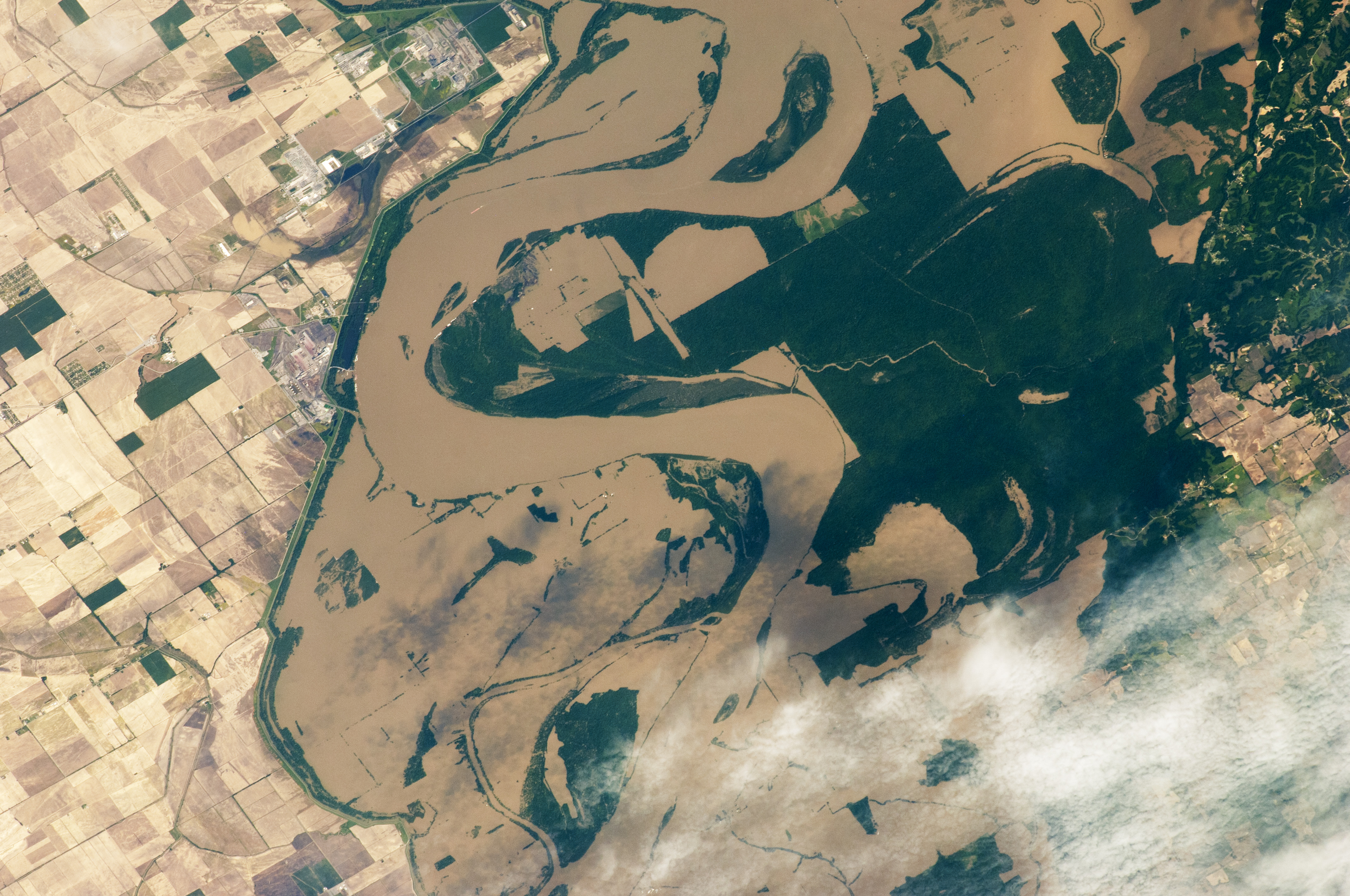 The Mississippi River spilled over its banks in Arkansas and Tennessee on May 12, 2011, as the International Space Station passed overhead. This astronaut photograph shows muddy water sitting on floodplains around Tomato, Arkansas, as well as extensive flooding to the north.