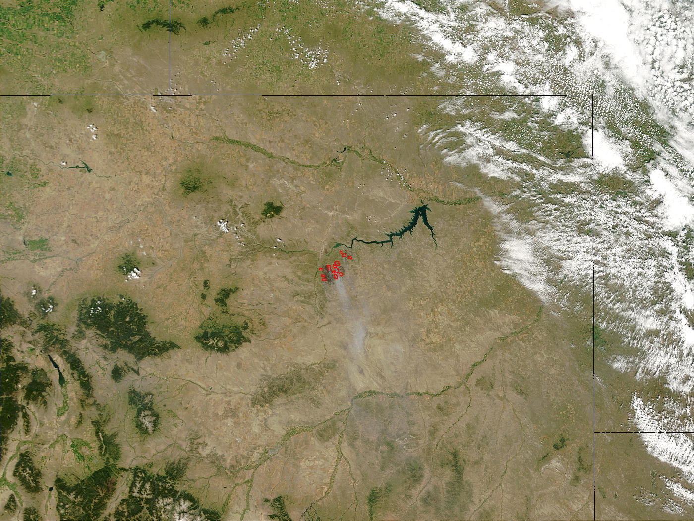The Missouri Breaks Complex Fire continued to grow on July 21, 2003. The fire had reached 105,000 acres as of July 22, and was still only 10 percent contained. Evacuations were still in effect as the complex of fires threatened at least 50 homes. This image is from the Terra MODIS sensor on July 21, and shows active fires marked in red.