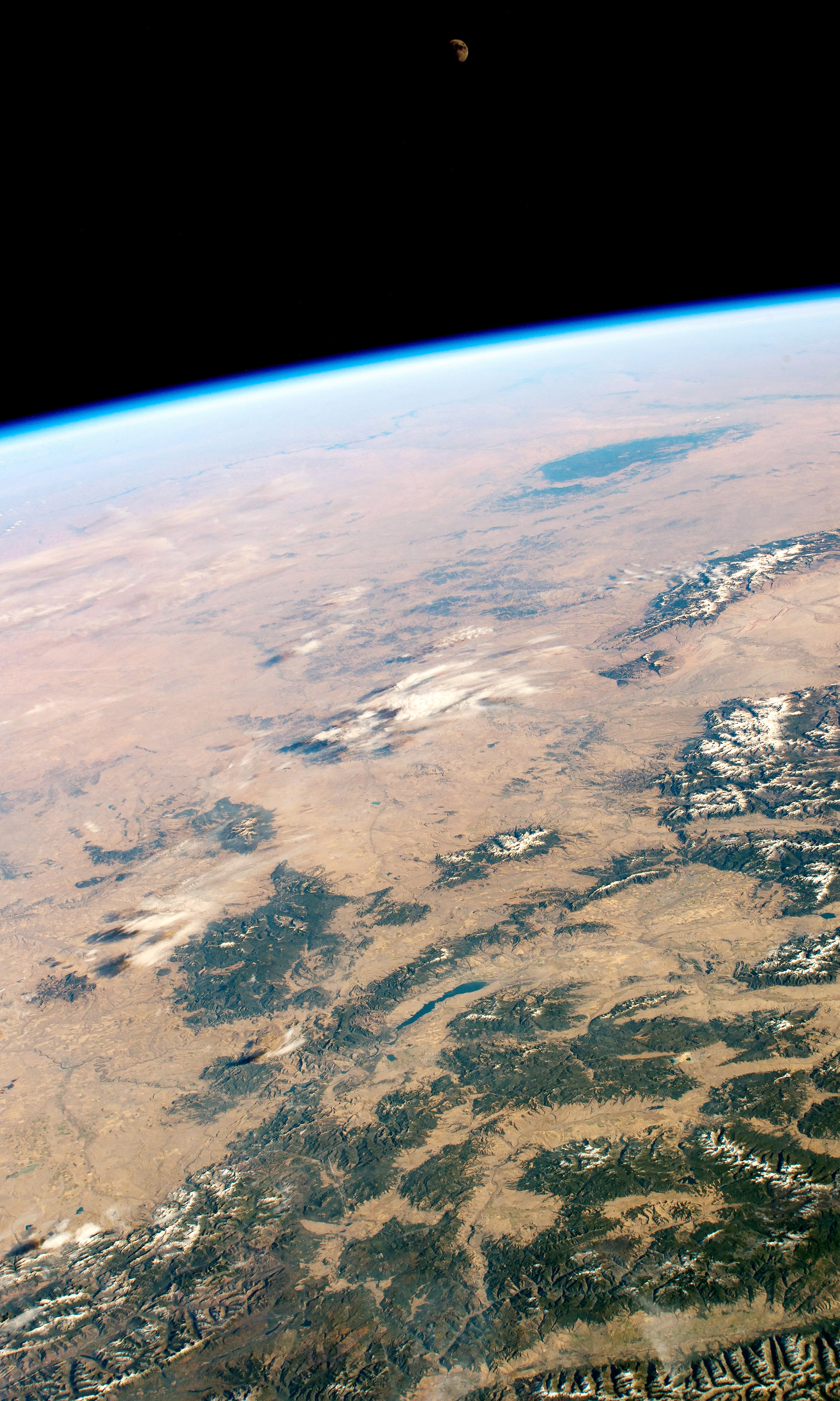 An astronaut shot this oblique photograph of the Missouri Plateau, where the Rocky Mountains meet the Great Plains of central-northwest United States. Across the scene, six national forests and grasslands stand at higher elevations in Montana, Wyoming, and South Dakota. Toward the horizon, the Missouri River is faintly visible snaking across North Dakota.