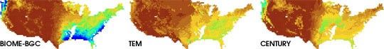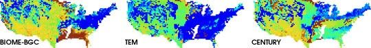 Each image is based on the output of a different computer model, each of which used current climate conditions and carbon dioxide concentrations to calculate plant productivity. (Image courtesy of the University of Montana Numerical Terradynamic Simulation Group)