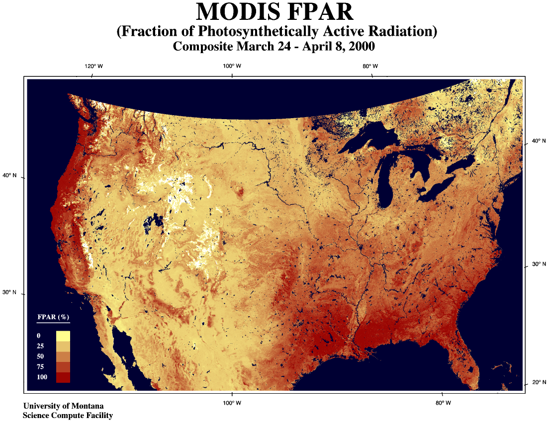 This composite image over the continental United States wasproduced with data acquired by the Moderate-resolution ImagingSpectroradiometer (MODIS) during the period March 24—April 8, 2000.The image is a map of the fraction of the photosyntheticallyavailable radiation that was absorbed by land vegetation forphotosynthesis. Notice how closely the high and low values in this imagecorresponds to yesterday's Leaf Area Index. Theseare the first two in a series of images over the continental U.S. produced by theMODIS Land Discipline Group (refer to this site on June 5 for the next image inthe series).