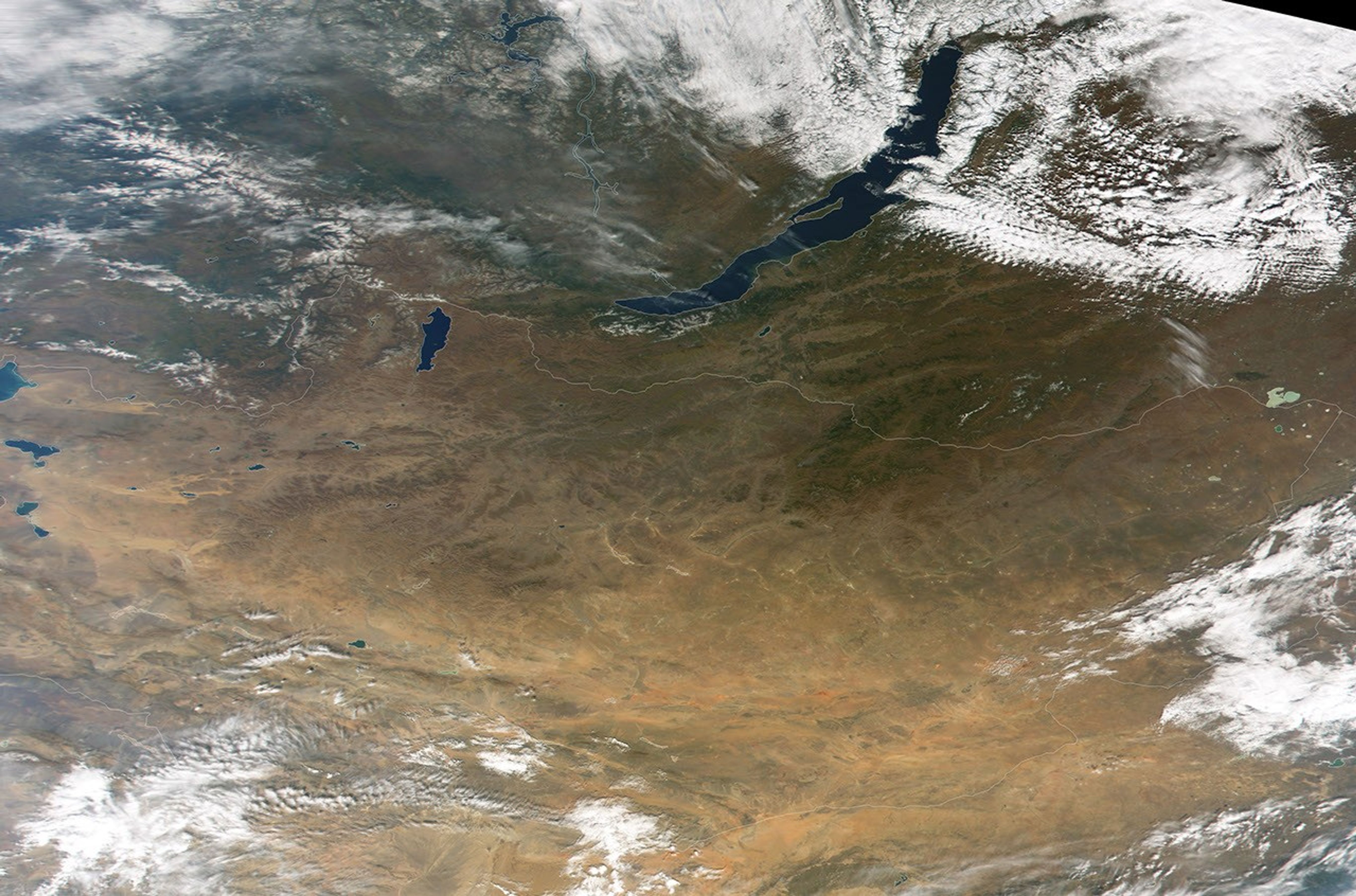 With winds that constantly whip dust across high plains, a nomadicpopulation that mostly lives in felt tents, and a local cuisine thatconsists of fermented goat milk and stewed meats, Mongolia is not aplace for the pampered. This true-color image of Mongolia was acquiredon March 27, 2000, by the Moderate-resolution Imaging Spectroradiometer(MODIS), flying aboard NASA’s Terra spacecraft. Most of the 2.3 millionMongolians live on the vast, rolling, semi-arid, grass-covered plateausthat stretch across eastern and northern Mongolia. In the image, theseareas are a dark reddish-brown. The faint herringbone pattern runningthrough eastern Mongolia is formed by the Kerulen and Orhon Gol riversand their tributaries.
