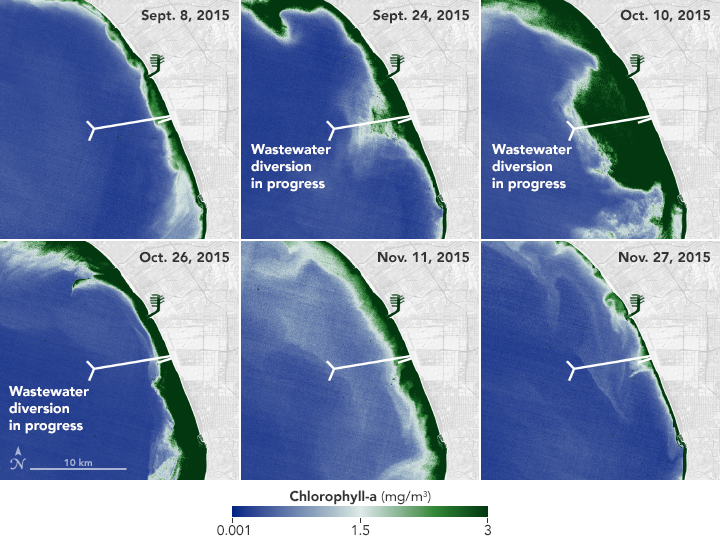 The Operational Land Imager (OLI) on Landsat 8 acquired a natural-color image of Santa Monica Bay (above) on October 10, 2015, midway through the shutdown. The green patches near the coast are phytoplankton blooms likely caused by an excess of nutrients from the nearshore wastewater discharge.