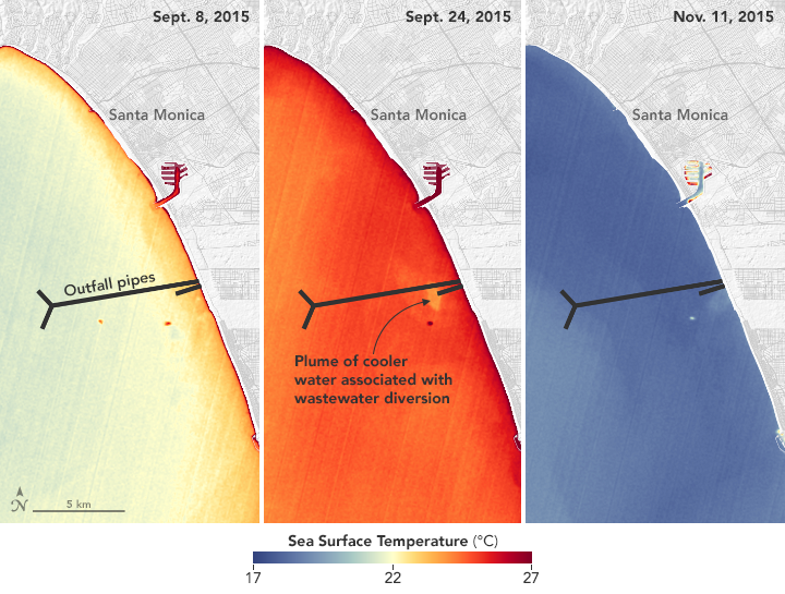These maps show the sea surface temperature of Santa Monica Bay before, during, and after wastewater was transported through the shorter pipe. The data was acquired by the Thermal Infrared Sensor (TIRS) on the Landsat 8 satellite. During the diversion, a cooler pool of water formed near the mouth of the one-mile pipe, as the plume of wastewater also brought colder water from the depths to the surface.