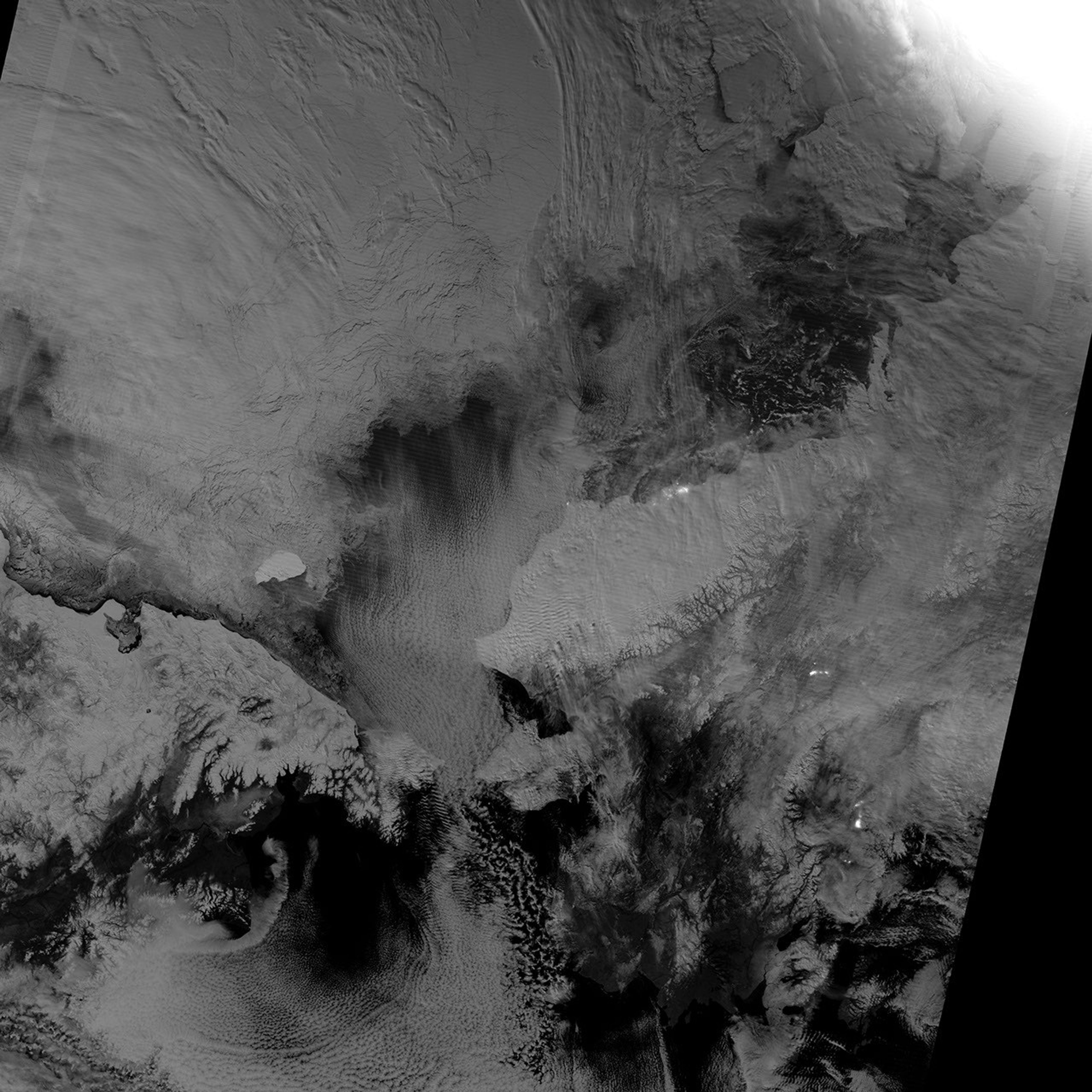 The day-night band takes advantage of moonlight, airglow (the atmosphere’s self-illumination through chemical reactions), zodiacal light (sunlight scattered by interplanetary dust), and starlight from the Milky Way. By using these dim light sources, the day-night band can detect changes in clouds, snow cover, and sea ice. The VIIRS day-night band offers a unique perspective because once polar night has descended, satellite sensors relying on visible light can no longer produce photo-like images. And although passive microwave sensors can monitor sea ice through the winter, they offer much lower resolution.