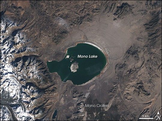Beginning in 1941, water diversions from the lake lowered its water level. Some evidence of the dropped water level appears in this image, in the off-white edging surrounding much of the lake. Although too small to appear in a satellite image, some features of the lakebed became apparent after water diversions. Tufa towers dot the perimeter of the lake, especially along its southern shore. Formed by the chemical interaction of calcium-rich springs and carbonate waters in the lake, these towers formed well below the lake’s surface, only to rise above it later, after water was diverted.