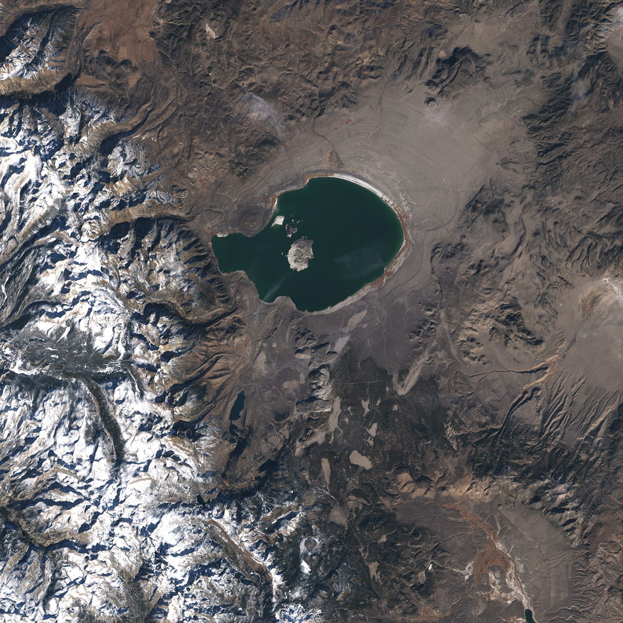 On December 16, 1999, NASA’s Landsat 7 satellite captured this image of Mono Lake and its surroundings. The area immediately around the lake is relatively flat, especially in the northeast. On all sides of the lake, however, the terrain is rugged, especially the snowcapped mountain ridges in the west. Aside from the white snowcaps, the landscape limits its color palette to earthen tones with very little green. Although the nearby mountains can sport some vegetation in the summertime, this area is quite arid.