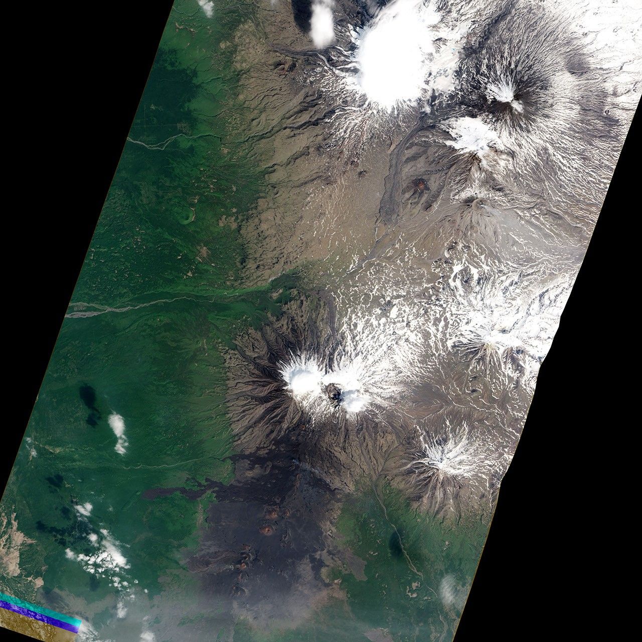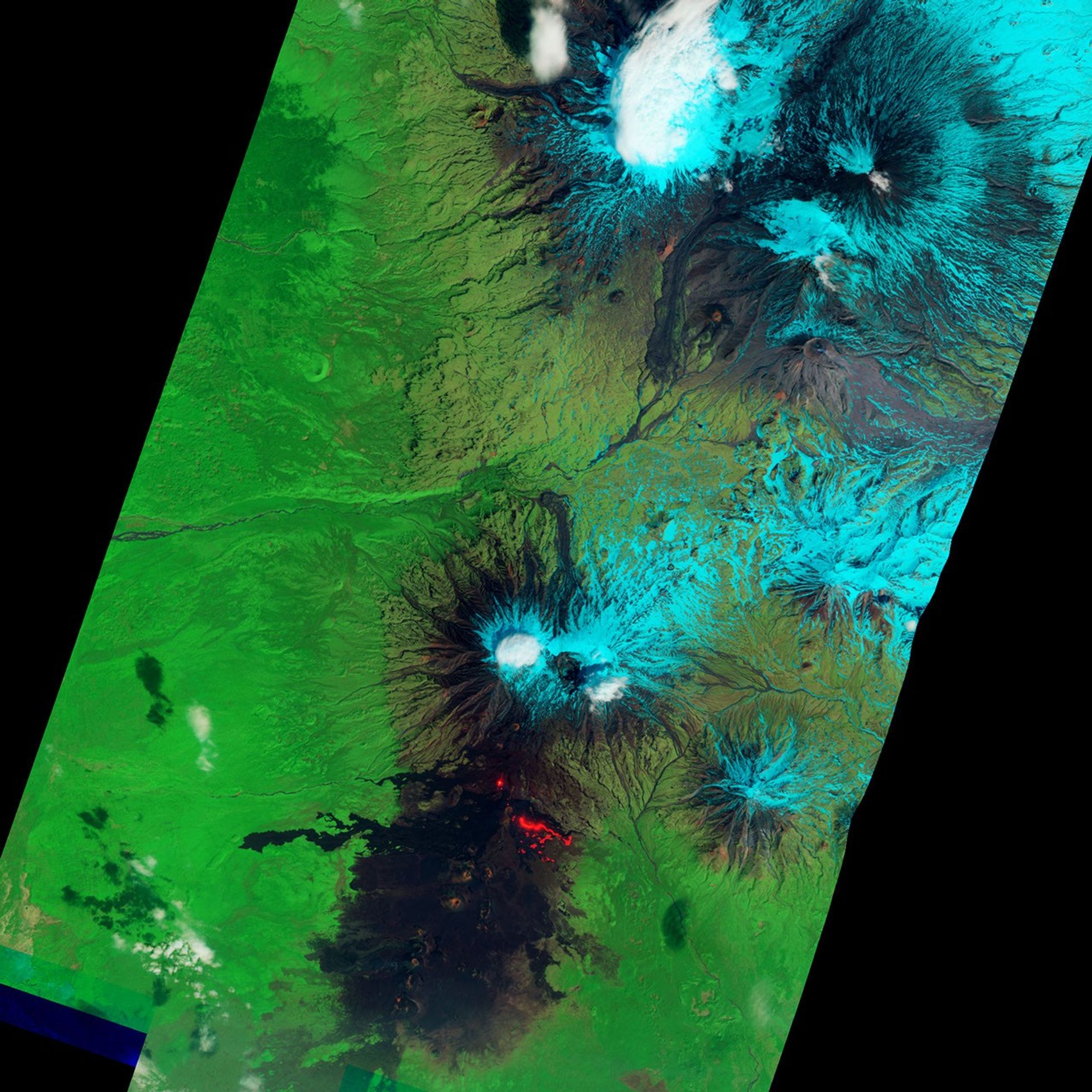 Shortwave infrared and near-infrared light (combined with green light in the lower, false-color image) highlight another aspect of Tolbachinsky Dol—the ongoing eruption of Tolbachik Volcano. Hot surfaces glow in shortwave infrared wavelengths. The active vent and lava flow are bright red, along with scattered lava “breakouts”at the front of the flow. High temperature surfaces in the scene also glow in near infrared light, revealing a lava pond in the active vent and fluid lava in the center of the lava flow.