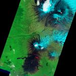 In visible light (top image), fresh lava flows are difficult to distinguish from the black rock of Tolbachinsky Dol, a volcanic plateau on Russia’s Kamchatka Peninsula. The high altitude and northern latitude of the plateau (as far north as Moscow) preserve the barren landscape left behind by past eruptions. In contrast, the fresh lava stands out clearly against the vivid green of low-elevation meadows and forest.