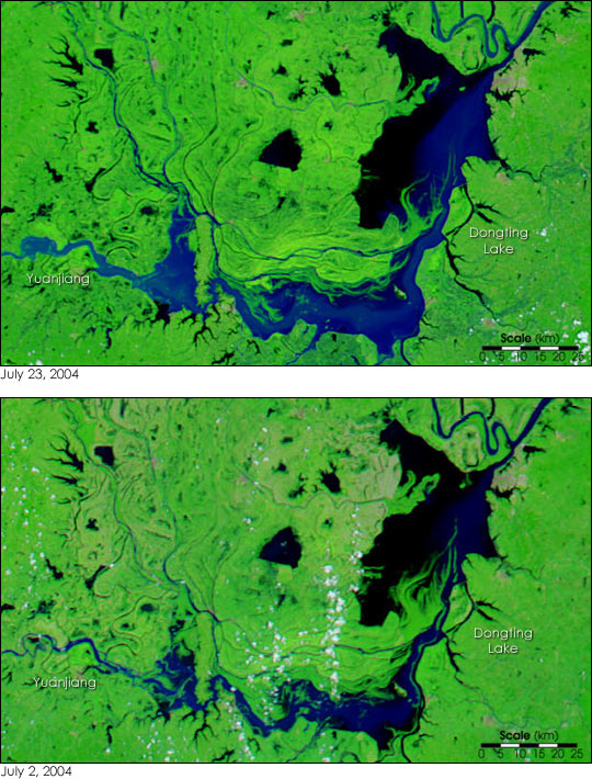 Monsoon rain continues to drench eastern China bringing with it the floods that annually plague the country. On July 23, 2004, the Moderate Resolution Imaging Spectroradiometer (MODIS) on NASA’s Terra satellite captured this image of floods around Dongting Lake in China’s Hunan province. The lake, the largest body of fresh water in China, covers the right half of the image. The southern sections of the lake are visibly larger on July 23 than they were in a MODIS image acquired by the Aqua satellite on July 2, 2004. The Yuanjiang River, which flows into Dongting Lake from the west, is also flooded. According to local news reports, water levels on both the lake and the river continue to rise.