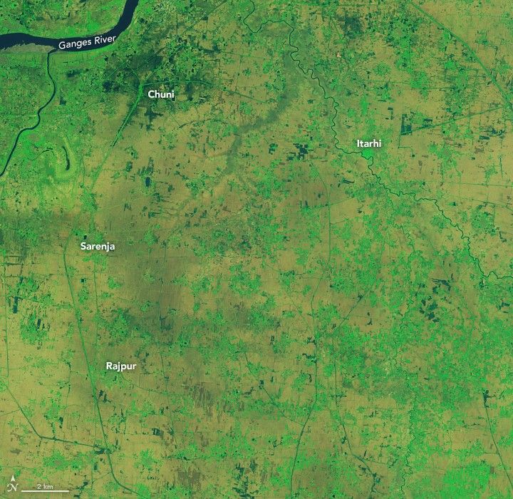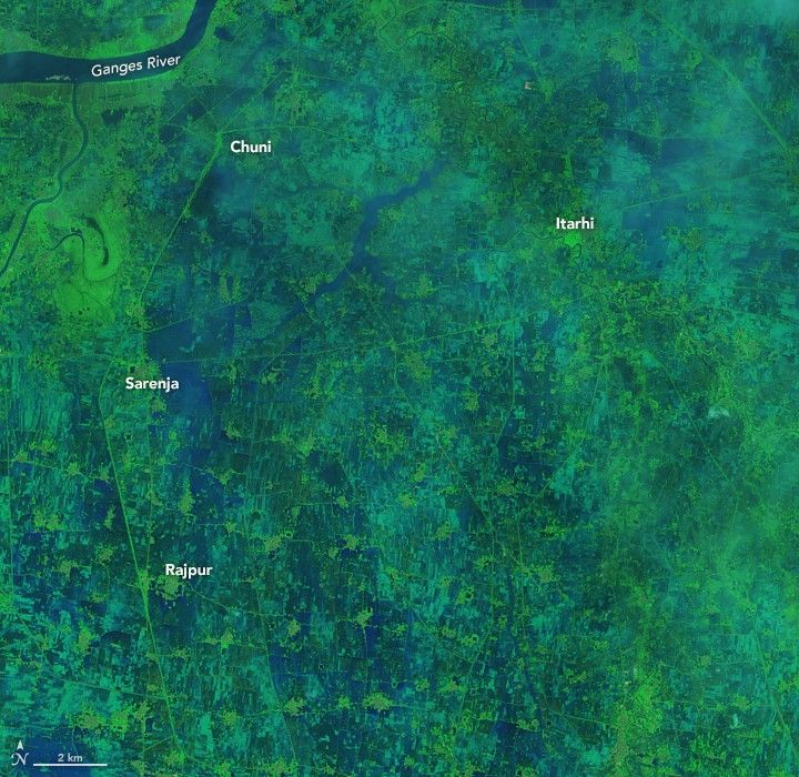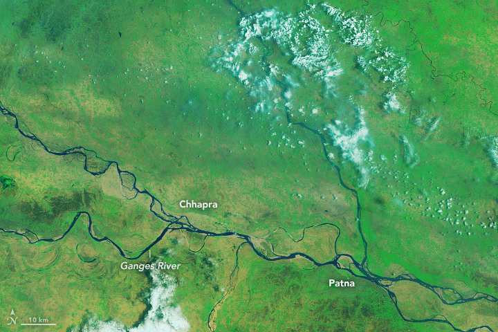 The Operational Land Imager (OLI) on Landsat 8 passed over northeastern India and observed the inundated landscape through breaks in the cloud cover. The images show cities and towns in Bihar state in northeastern India, which endured some of the worst flooding. India’s Assam state and the countries of Nepal and Bangladesh also have faced dire conditions, some of which are visible in this wide view of the region.