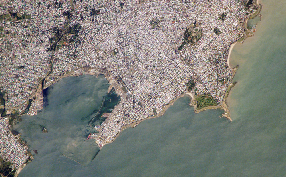 Reflective roofing materials and dark asphalt streets outline the urban grid pattern of Uruguay’s capital city, Montevideo, in this astronaut photograph. The city may be viewed as a precursor of a global population shift from dominantly rural to urban environments, a shift the United Nations estimates will occur by 2030. Nearly half of Uruguay’s total population now lives in the Montevideo metropolitan area. Located on the southern coastline of Uruguay along the Rio de la Plata, Montevideo Bay provides an important harbor and port facilities for transport of South American agricultural products.