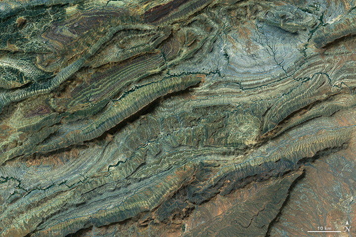 On July 2, 2016, the Operational Land Imager (OLI) on Landsat 8 captured this natural-color image of rugged terrain in the eastern part of the range. The OLI image has been draped on a digital elevation model made with data from the Advanced Spaceborne Thermal Emission and Reflection Radiometer (ASTER) sensor on the Terra satellite. From this oblique perspective, the Anti-Atlas mountains are visible in the distance beyond the city of Goulmima. Note that north is at the bottom of this image.
