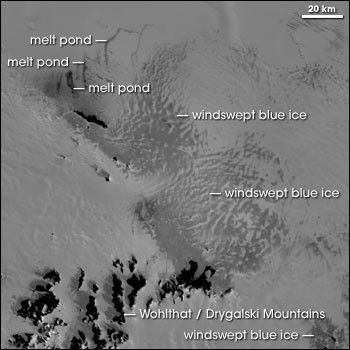 The MOA imagery has a grayscale color scheme, but in a land of snow and ice, color isn’t as crucial as it would be in forested or farmed land. Some patches of color do appear on the ice, however. For example, over time, windswept snow can eventually transform into pure ice composed of big crystals. On the ground, this thick, clear ice appears blue. To identify colored features like blue ice, scientists can make pseudo-color images by combining the grayscale MOA images with MODIS data from different parts of the light spectrum, including red and infrared light.