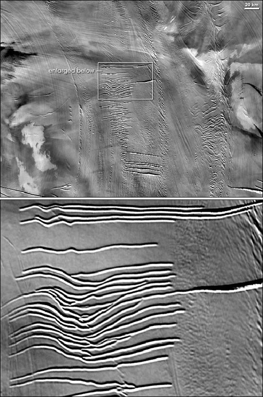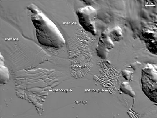 Detailed as it is, MOA is not intended to work in isolation; scientists designed it to integrate well with other images. For example, NASA and the Byrd Polar Research Center previously published an image of Antarctica based on radar data from the Radarsat Antarctic Mapping Project Antarctic Mapping Mission 1 (RAMP AMM-1). “In fact, we used RAMP data as a reference when we built MOA,” says Scambos. “RAMP is great for looking at subsurface features. MOA focuses on the surface. So depending on what you’re looking for, you can use either mosaic alone, or combine them [MOA and RAMP maps] for a more complete picture.”